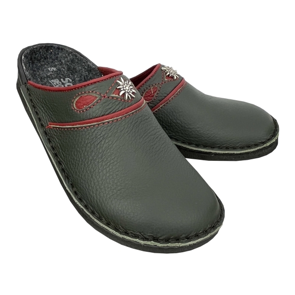 Unser Klassiker seit vielen Jahren! Die Schmidt's PANTOS Pantoffeln aus handgenähtem Rindleder in hochwertiger zwiegenähter Qualität sind der ideale Begleiter für Ihre Freizeit und Outdoor-Aktivitäten. Dieses Damenmodell in elegantem jagdlichem Grün besticht durch aufwendig paspelierte Ränder und Details in edlem Weinrot sowie eine geschmackvolle Edelweiß-Applikation aus einer Kombination von Leder und Metall. Das wärmende Filzfußbett sorgt für angenehme Wärme von unten und bietet sicheren Halt. Die robuste Polyurethan-Sohle und die ergonomische, weite Passform gewährleisten Komfort und Stabilität bei der Hausarbeit, im Garten oder in der Jagdhütte. Hergestellt in unserer europäischen Produktion, haben sich diese Pantoffeln seit vielen Jahren als verlässliche Wohlfühlschuhe bewährt – perfekt für gemütliche Stunden im Winter und nach einem erfolgreichen Tag auf der Jagd.