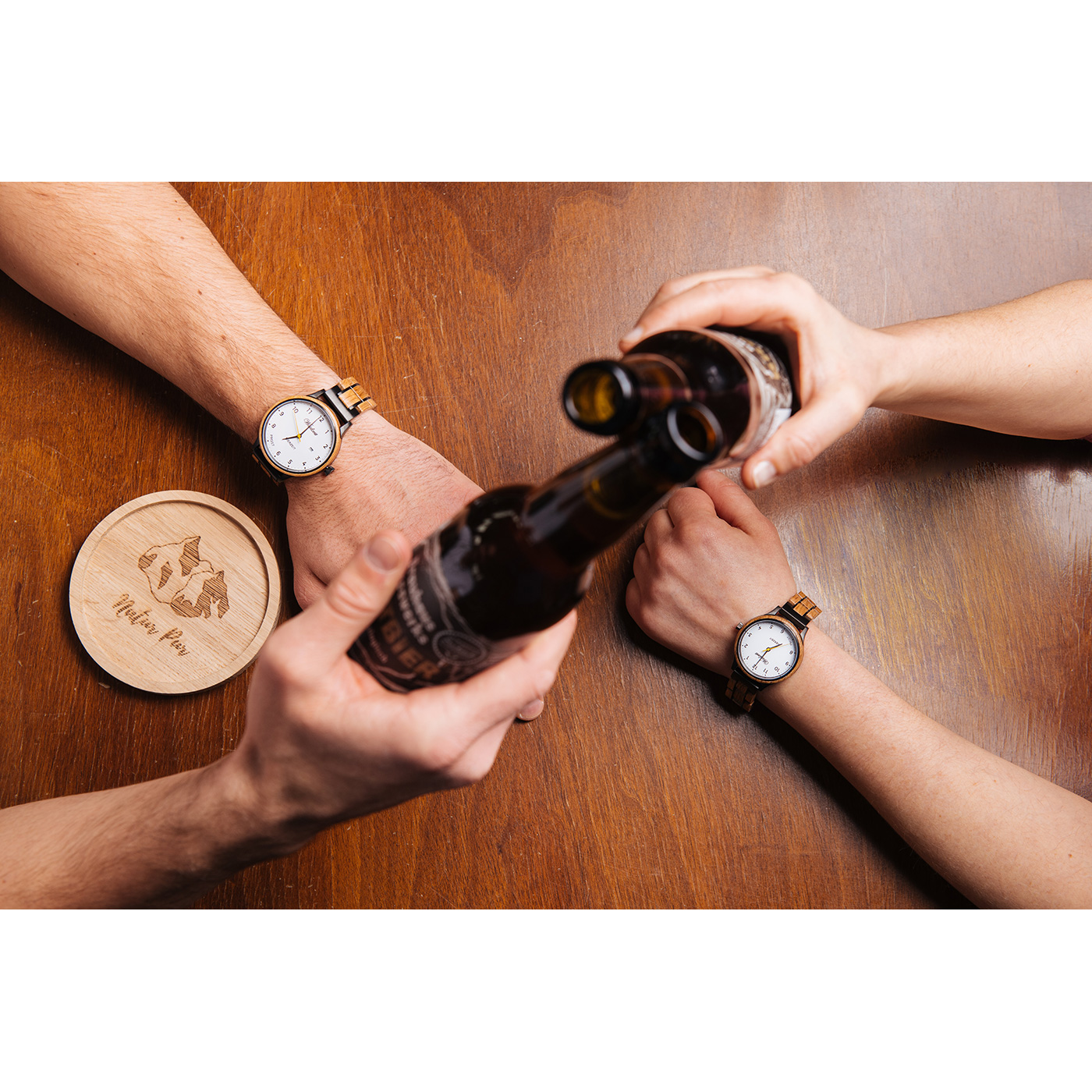 Die Bierzeit Uhr aus einem wiederverwerteten Craftbier-Fass ist eine wunderschöne Damenuhr. Neben dem recycelten Eichenfassholz besticht die Waidzeit Uhr mit einem klassisch zeitlosen Ziffernblatt. Die Raffinesse bei der Holzuhr ist zudem, dass "Prost" statt der Zahl 7 vorhanden ist und der Sekundenzeiger spiegelt die goldene Farbe des Bieres wieder. Das Holzarmband der Damenuhr ist mit Edelstahlelementen verstärkt. Ein tolles Geschenk für alle Bierliebhaberinnen!
