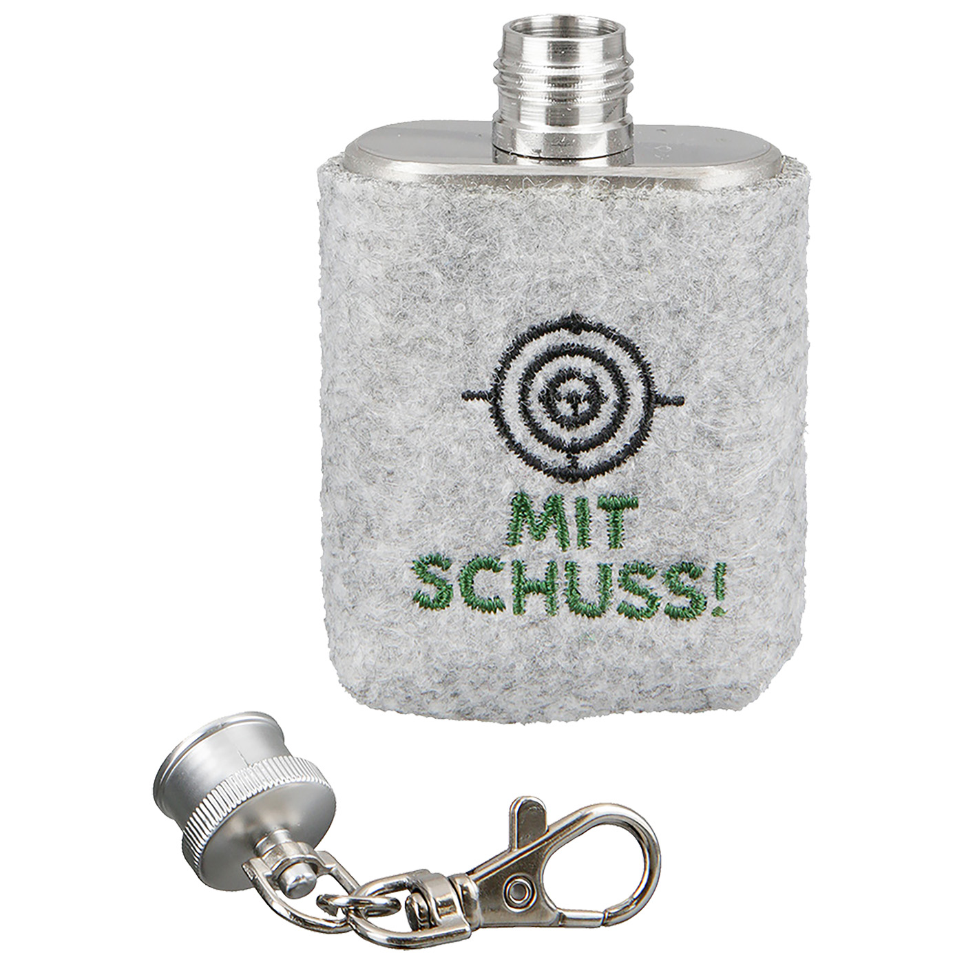 Schlüsselanhänger Flachmann "Mit Schuss!" von Gilde – ein stilvolles Accessoire für unterwegs! Der Anhänger besteht aus hochwertigem, hellgrauem Filz mit trendigen, gestickten Motiv. Der Flachmann, gefertigt aus robustem Edelstahl 304, bietet eine Füllmenge von 30ml, schmückt nicht nur Ihren Schlüsselbund, sondern ist auch ein praktisches Accessoire. Der Gilde Schlüsselanhänger Flachmann ist das ideale Geschenk für Genießer mit Stil und Humor! Maße: 2,5x4,5x8cm (LxBxH)