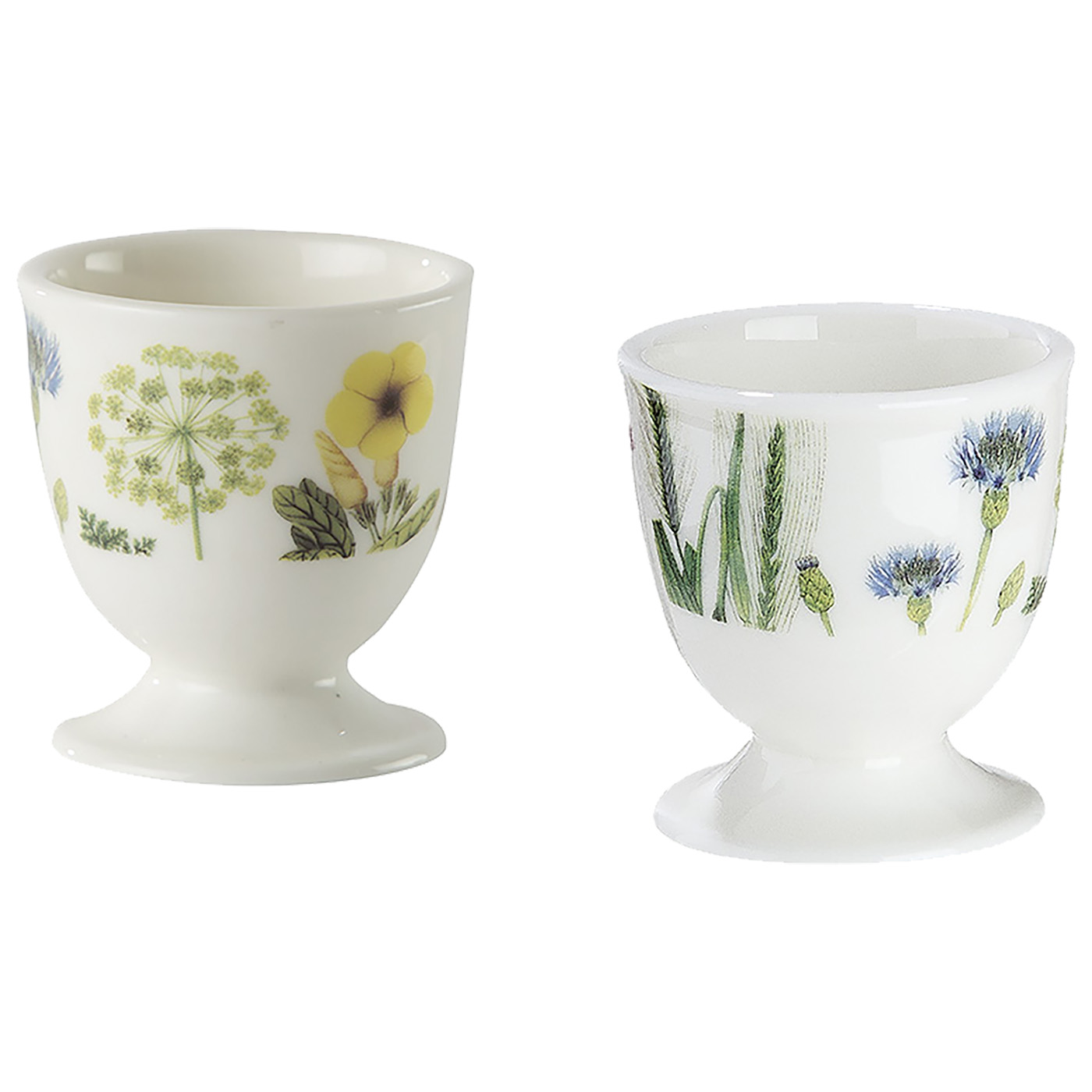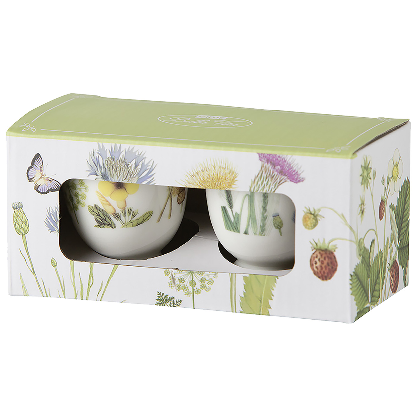 Eierbecher Set "Wild Flowers" mit trendigen Wildblumendesign und Schmetterlingen aus weißem Porzellan, lebensmittelecht, spülmaschinenfest und mikrowellengeeignet. In dekorativer Geschenkverpackung mit Blüten-/Schmetterlingdesign "Bella Vita".Höhe: 5,4cm, Durchmesser: 5cm