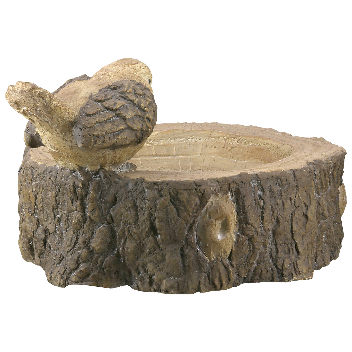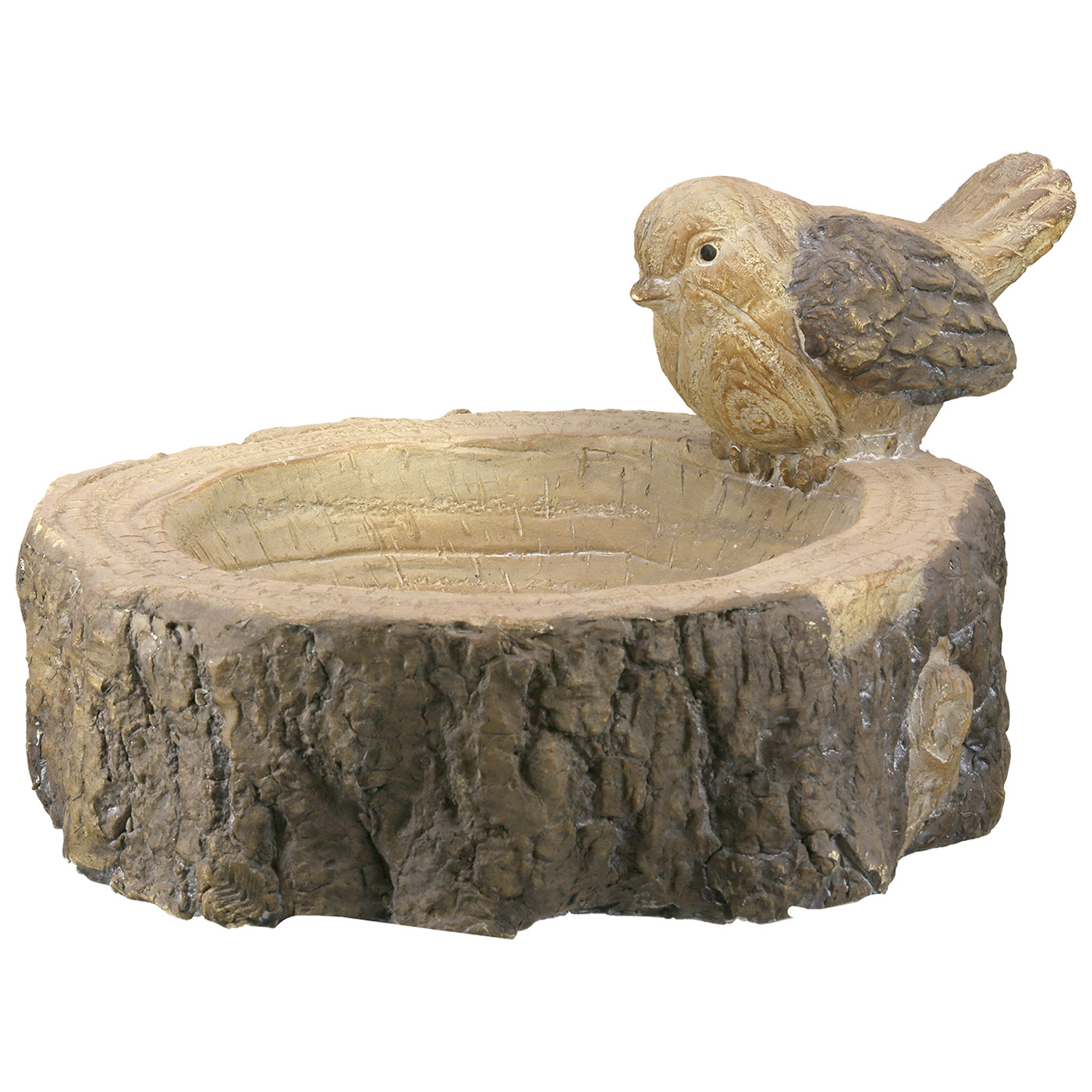 Rustikale, wetterfeste, natürlich wirkende, runde Vogeltränke Tronco – Baumstamm-Motiv mit Vogel, aus Spezialkeramik in Holzoptik. Maße: 30 x 24,5 x 15,5 cm. Gewicht: 1,62kg