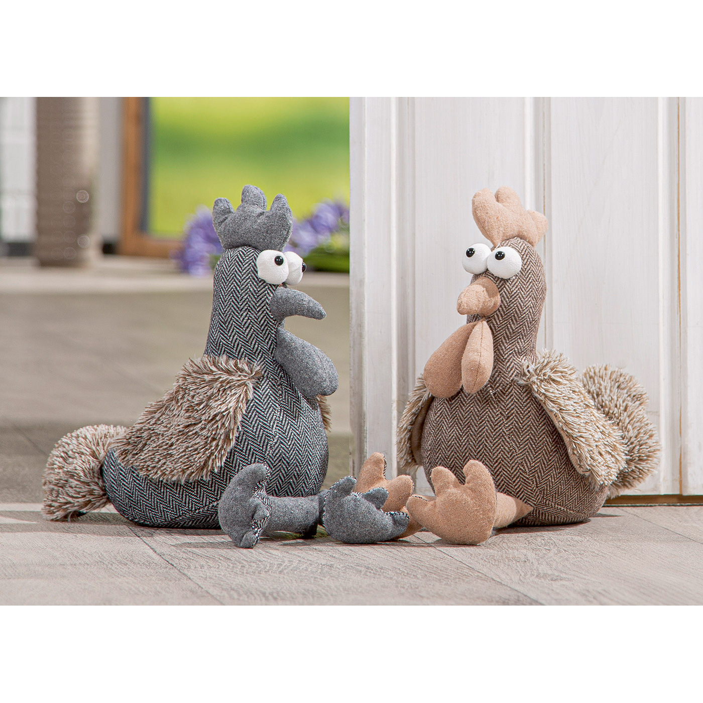 Originelle, witzige Türstopper Gallina in Huhnform - je ein Huhn in grau mit Schlenkerbeinen und ein Huhn in braun. Maße: sitzend 25,0cm / mit Beinen 39,5cm