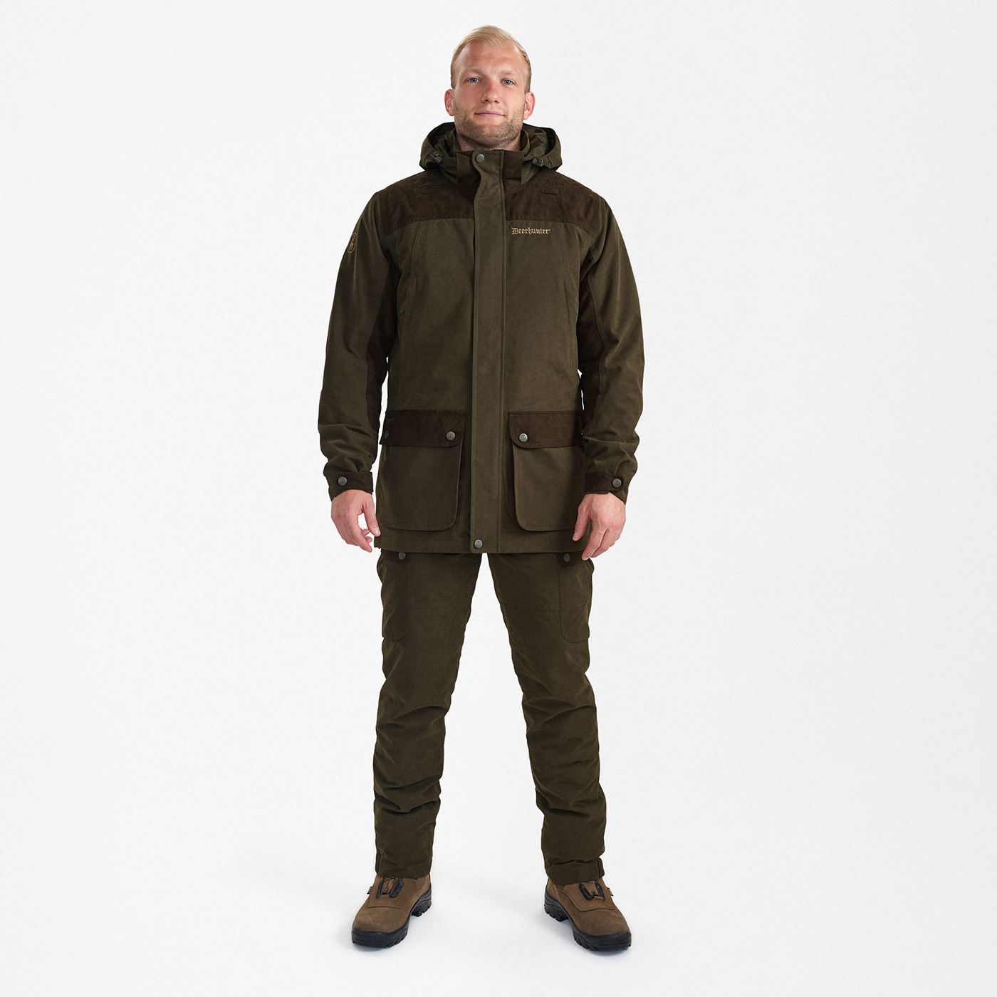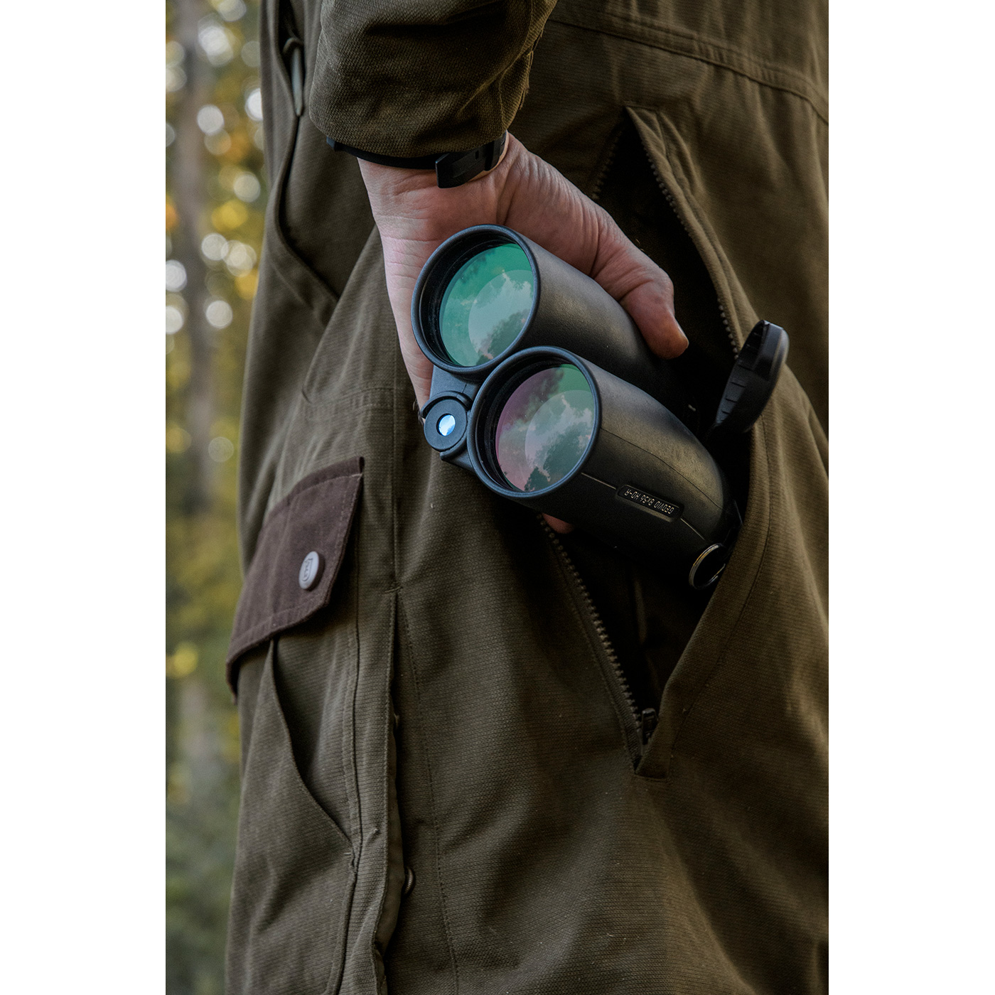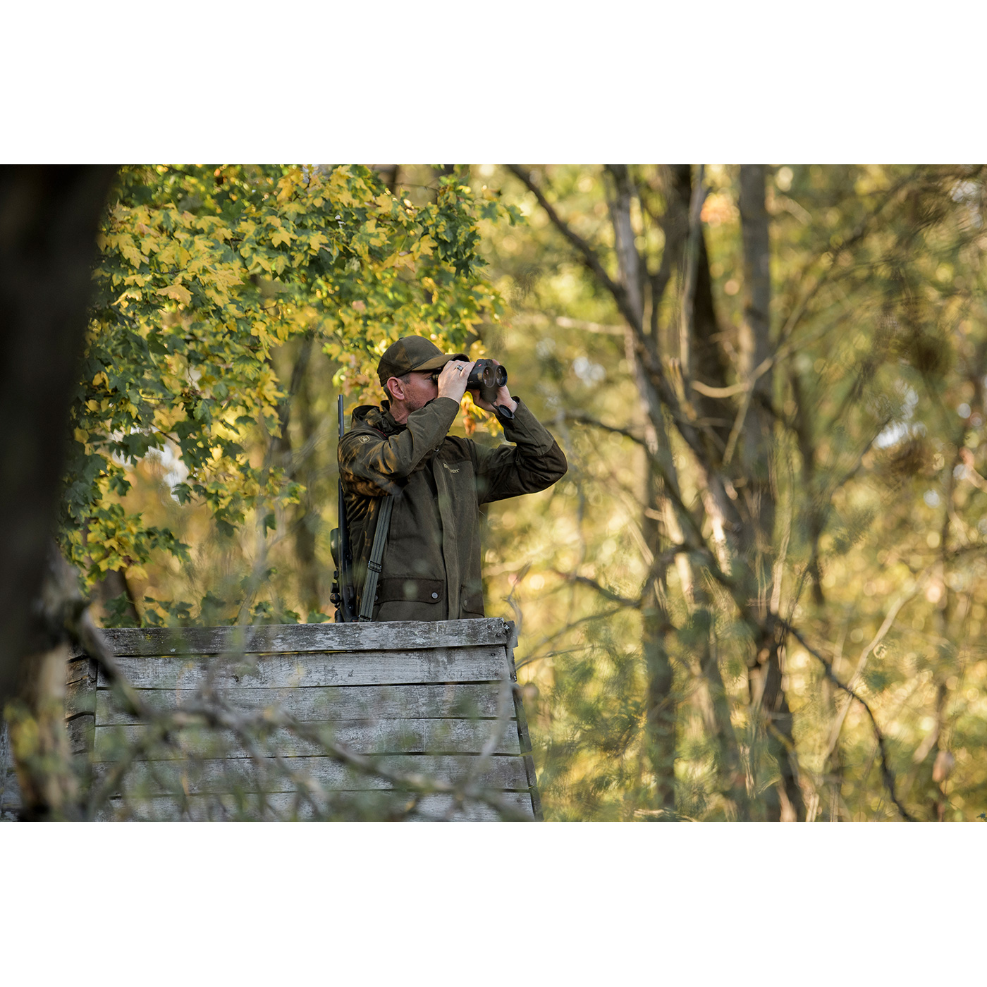 Die Eagle Jacke bietet Komfort bei der aktiven Jagd unter allen Witterungsbedingungen. Wasserdicht (8000 mm), Winddicht (5000 g) & Atmungsaktiv. Sie eignet sich sowohl für Jagdanfänger als auch für den erfahrenen Jäger, der Vielseitigkeit verlangt. Die Jacke ist bequem, schützt vor Witterungseinflüssen und ermöglicht die volle Konzentration auf die Jagd. Details aus Wildlederimitat unterstreichen den klassischen Jagdstil. Die Deer-Tex® Performance Shell Membrane sorgt für Wind- und Wasserdichtigkeit, Atmungsaktivität und ein angenehmes Innenklima. Hinzu kommen eine Reihe praktischer Ausstattungsmerkmale wie eine Funkgerätetasche mit Schlaufe für die Antenne, 2 geräumige Taschen mit Taschenklappe für leichten Zugriff auf der Vorderseite, 1 Hasentasche mit verdecktem Reißverschluss auf beiden Seiten für einfaches Handling sowie mehrere Innen- und Außentaschen mit Reißverschluss, in denen Jagdutensilien schnell verstaut und während der Jagd griffbereit sind. Die verstellbaren Ärmelbündchen und die vorgeformten Ellbogen sorgen für eine gute Passform und die abnehmbare Kapuze lässt sich individuell einstellen. Die vielseitige Eagle Jacke ist ein unverzichtbarer Bestandteil jeder Jagdgarderobe und für alle Jahreszeiten geeignet.