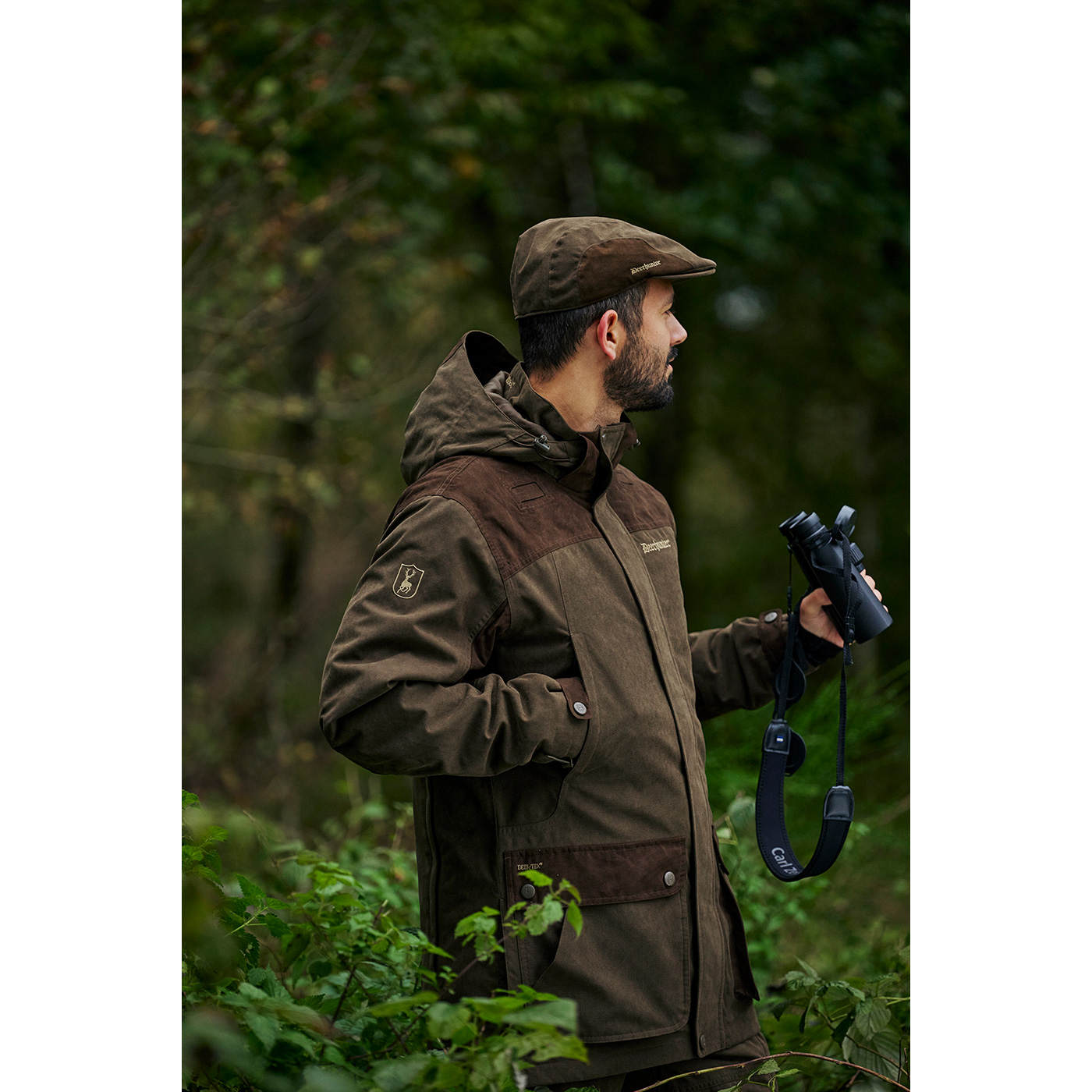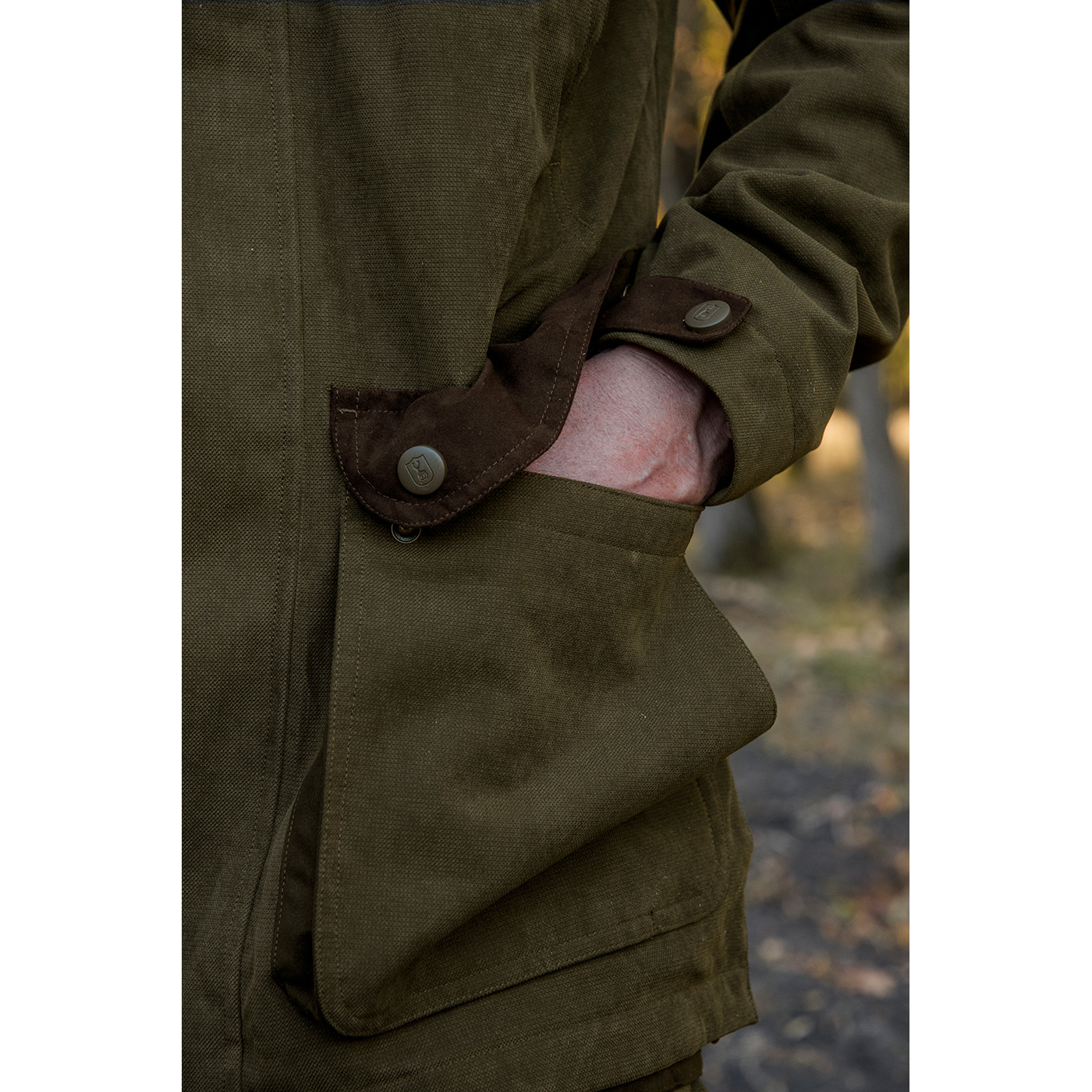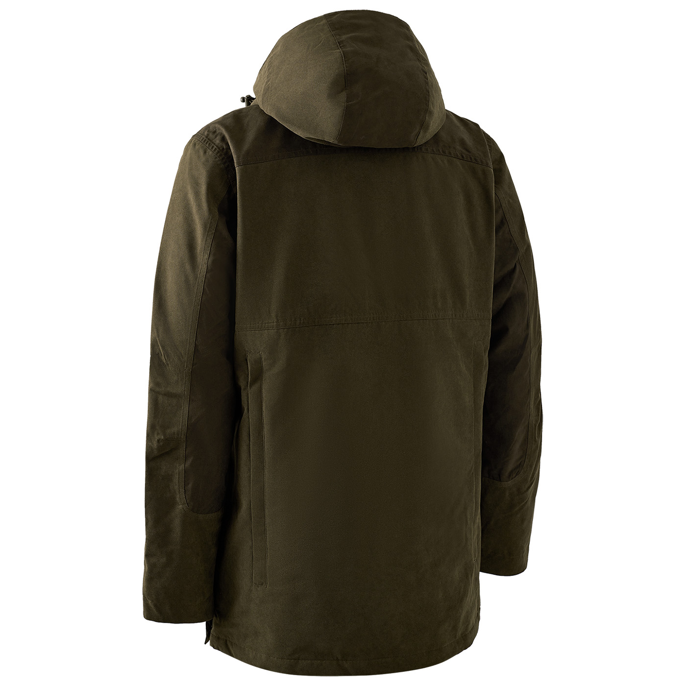 Die Eagle Jacke bietet Komfort bei der aktiven Jagd unter allen Witterungsbedingungen. Wasserdicht (8000 mm), Winddicht (5000 g) & Atmungsaktiv. Sie eignet sich sowohl für Jagdanfänger als auch für den erfahrenen Jäger, der Vielseitigkeit verlangt. Die Jacke ist bequem, schützt vor Witterungseinflüssen und ermöglicht die volle Konzentration auf die Jagd. Details aus Wildlederimitat unterstreichen den klassischen Jagdstil. Die Deer-Tex® Performance Shell Membrane sorgt für Wind- und Wasserdichtigkeit, Atmungsaktivität und ein angenehmes Innenklima. Hinzu kommen eine Reihe praktischer Ausstattungsmerkmale wie eine Funkgerätetasche mit Schlaufe für die Antenne, 2 geräumige Taschen mit Taschenklappe für leichten Zugriff auf der Vorderseite, 1 Hasentasche mit verdecktem Reißverschluss auf beiden Seiten für einfaches Handling sowie mehrere Innen- und Außentaschen mit Reißverschluss, in denen Jagdutensilien schnell verstaut und während der Jagd griffbereit sind. Die verstellbaren Ärmelbündchen und die vorgeformten Ellbogen sorgen für eine gute Passform und die abnehmbare Kapuze lässt sich individuell einstellen. Die vielseitige Eagle Jacke ist ein unverzichtbarer Bestandteil jeder Jagdgarderobe und für alle Jahreszeiten geeignet.