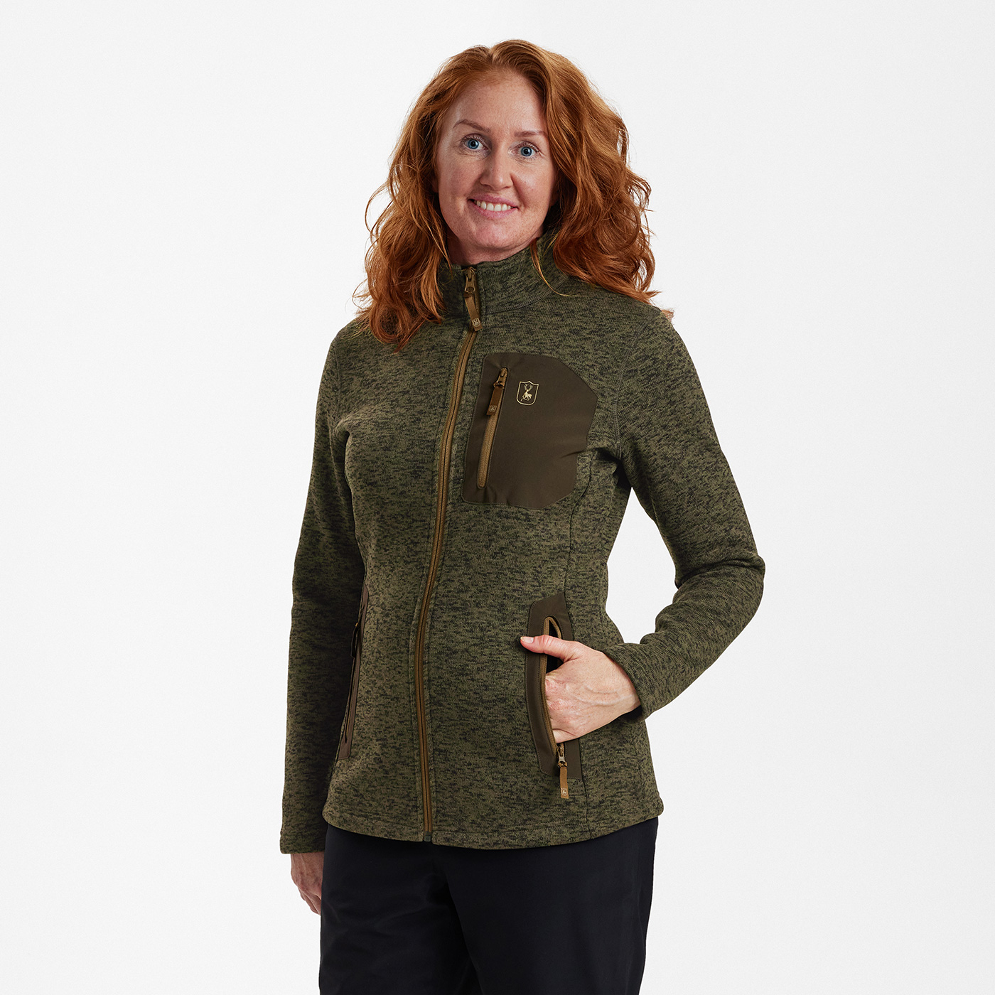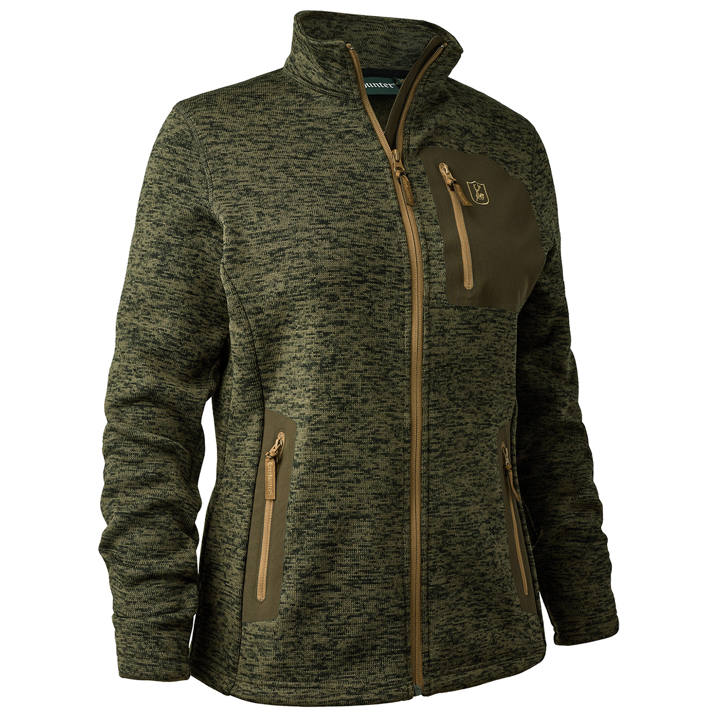 Die Strickjacke Lady Sarek von Deerhunter mit charakteristischem 2-Wege-Stretchmaterial und geräuscharmem Gewebe besticht durch ihre schmeichelhafte, feminine Passform. Funktionale Strickjacke mit durchgehendem Frontreißverschluss, 2 seitlichen Einschubtaschen mit Reißverschluss und 1 Reißverschluss-Brusttasche. Sie ist die ideale Zwischenschicht für höchsten Komfort auf der Jagd, und sie ermöglicht Ihnen, sich frei und leise zu bewegen. Eine vielseitige Ergänzung für Ihre Outdoor-Garderobe. Sie kann an kalten, nassen Tagen mit einer Außenschicht kombiniert oder an wärmeren Tagen als Outdoor-Jacke getragen werden. OEKO-TEX® zertifiziert