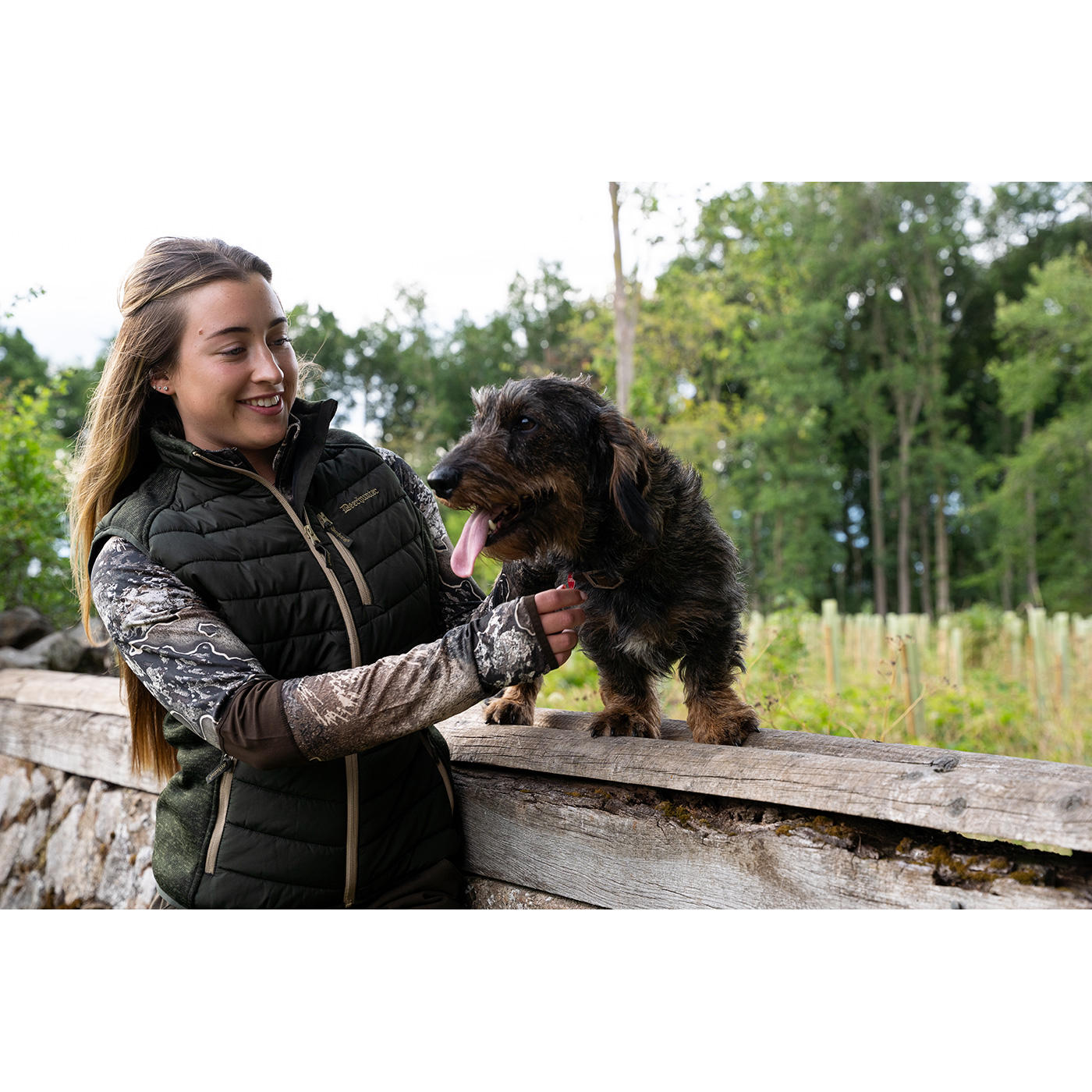 Die wattierte Damen Steppjacke Lady Moor mit Strickfleece Einsätzen bietet leichte Wärme, Bewegungsfreiheit und eine schmeichelhafte Passform für aktive Outdoor-Aktivitäten. Mit DEER-TEX® Temp-Wattierung wärmt sie angenehm an kühlen Tagen. Die Wattierung und Isolierung dient dazu, den Körper warmzuhalten, um nicht zu frieren und den ganzen Tag über eine gleichbleibende Körpertemperatur zu gewährleisten. Die Strickeinsätze an Seiten, Schultern und Ärmeln verbessern die Beweglichkeit und sorgen für eine feminine Silhouette. Elastische Abschlüsse an Ärmelbündchen und Saum halten die Wärme drinnen. Eine vertikale Brusttasche und 2 Fronttaschen mit Reißverschluss bieten praktischen Stauraum. Ideal zum Überziehen oder unter eine Außenschicht – ein vielseitiger Begleiter für Jagd und Alltag.