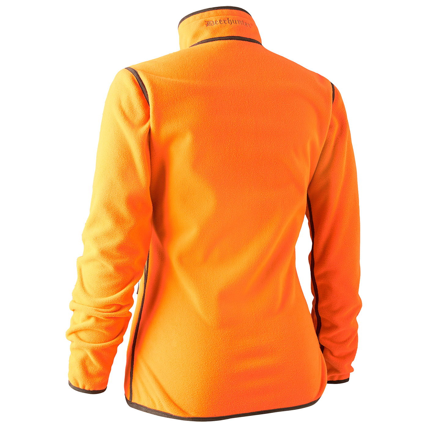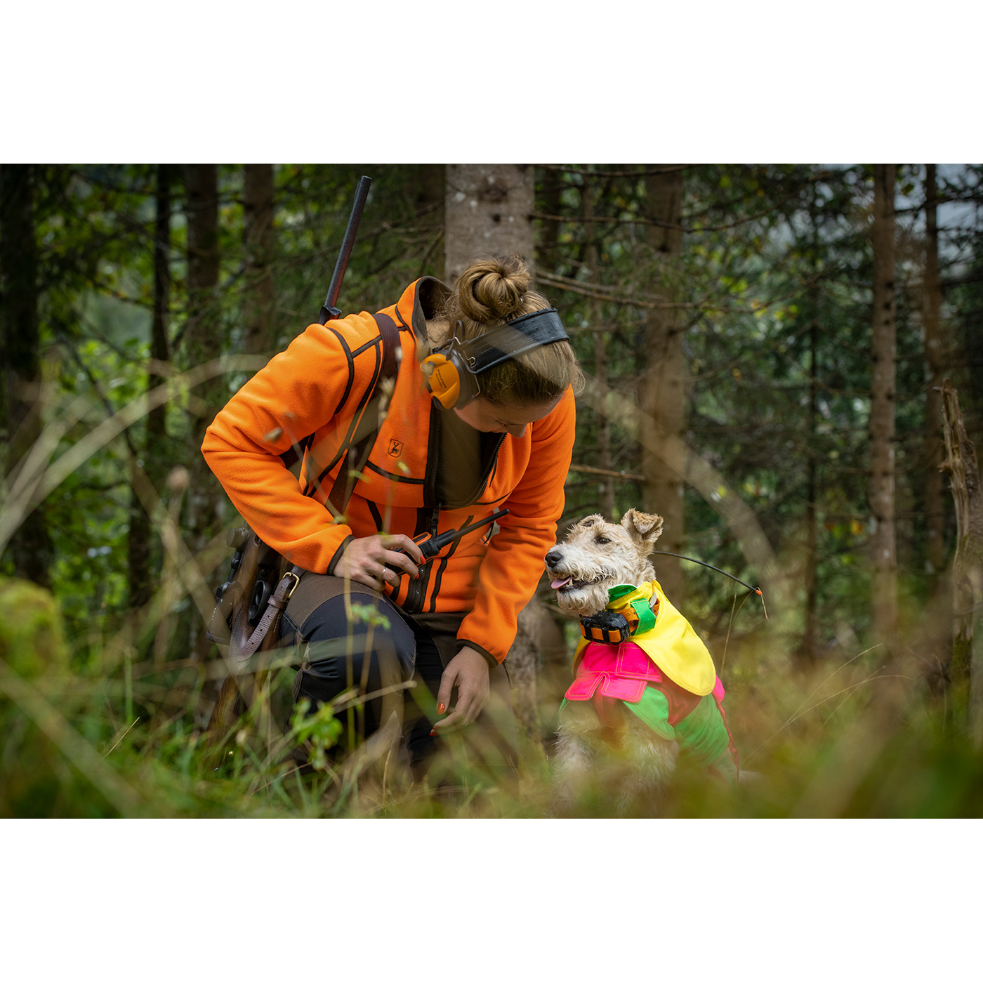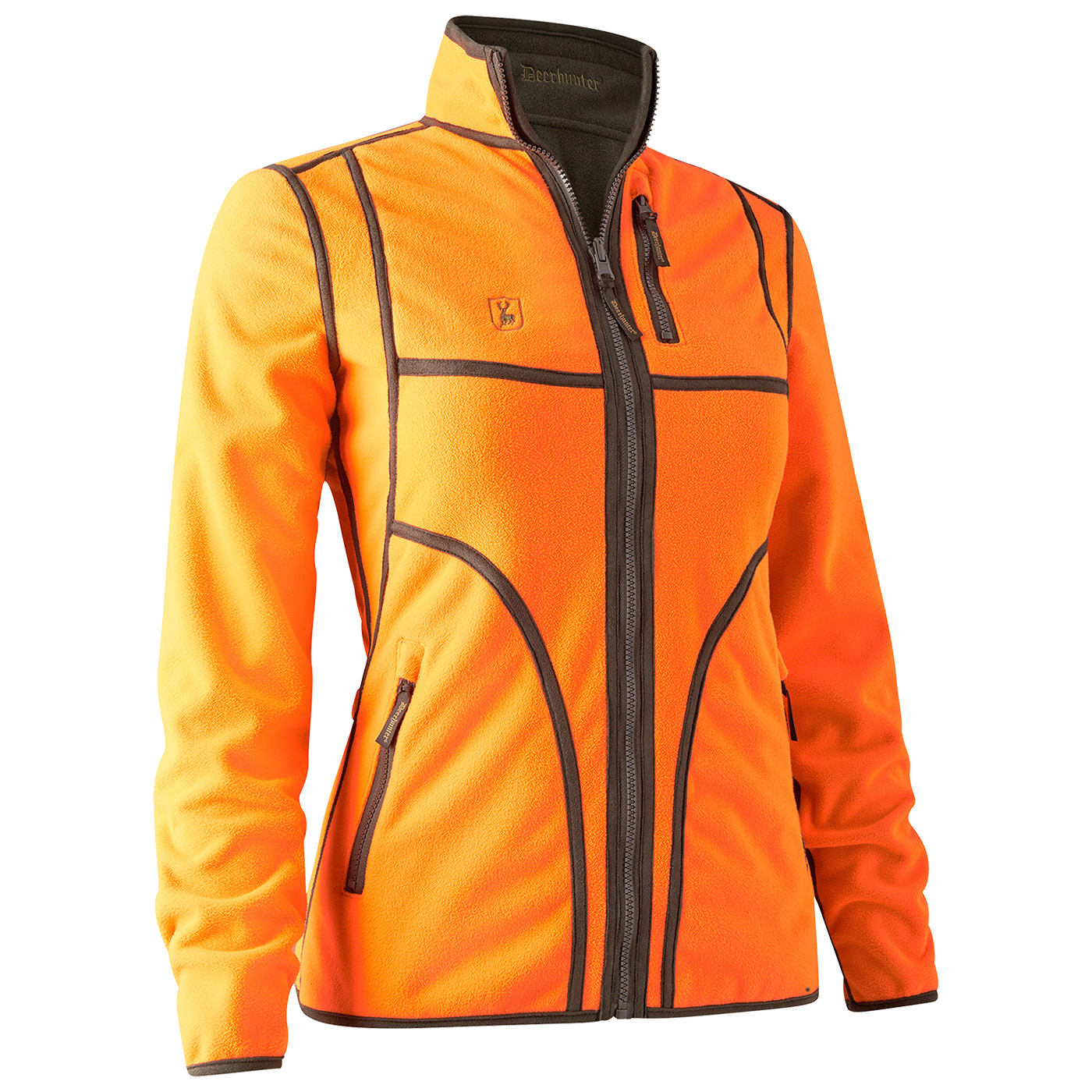 Die Wende-Fleecejacke Lady Pam Bonded ist mit der Deerhunter Stormliner Membrane ausgestattet und daher wasserdicht (5000 mm), winddicht (3000 g) und atmungsaktiv – wichtige Features für jede aktive Outdoor-Lady und eine vielseitige Lösung für alle Outdoor-Situationen. Ob Sie mit dem Hund spazieren gehen, die Kinder zur Schule bringen oder einen Tag auf dem Terrain verbringen: Die Wende-Fleecejacke Lady Pam Bonded aus Fleece bietet zwei tolle Modelle in einer Jacke. Der klassische Uni-Farbton und die paspelierte Einfassung aus Wildlederimitat der einen Seite sorgen für einen traditionellen Country-Look, der sich mit klassischen Jeans und Stiefeln zu einem eleganten, lässigen Outfit kombinieren lässt. Auf links gedreht bietet die Jacke mit ihrem leuchtenden Orangefarbton Sichtbarkeit im Terrain, ist CE-gekennzeichnet sowie nach PPE CAT II zertifiziert für zusätzliche Sicherheit. Drei Vordertaschen und drei Innentaschen mit verdeckten Reißverschlüssen runden die Jacke Lady Pam Bonded ab, die aus einem weichen, geräuscharmen Fleece gefertigt ist.
