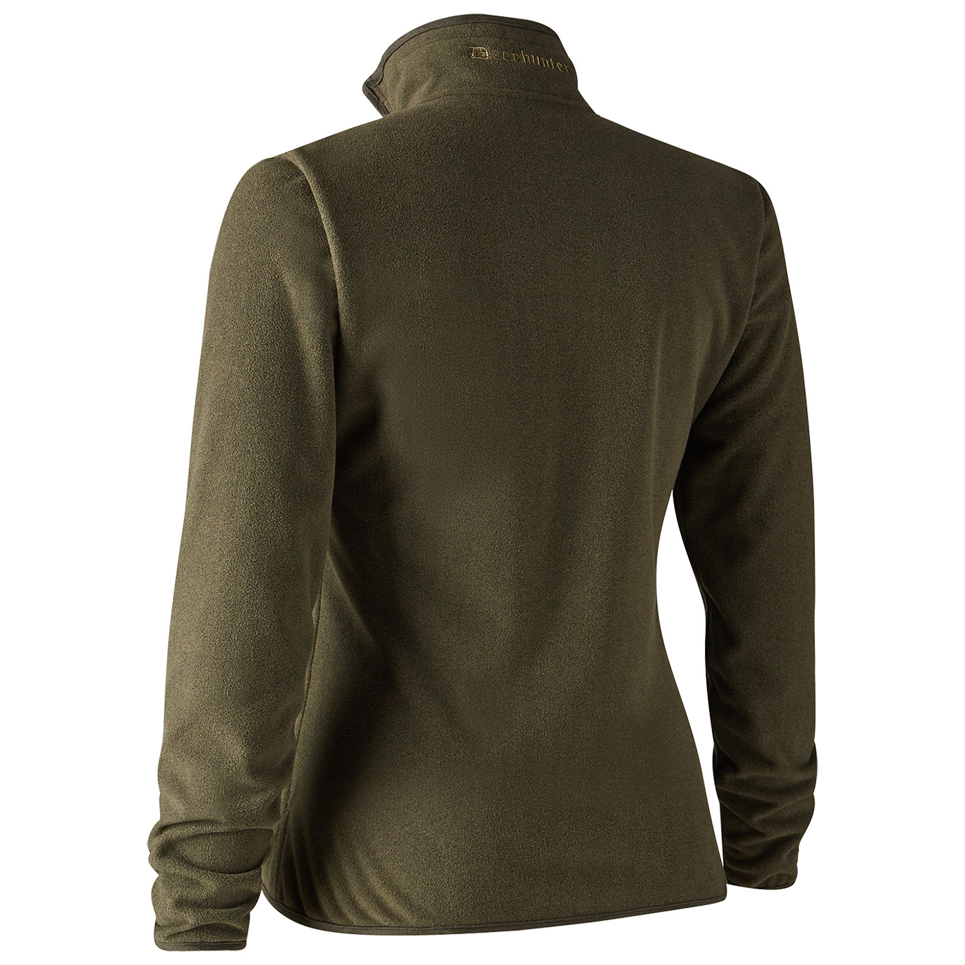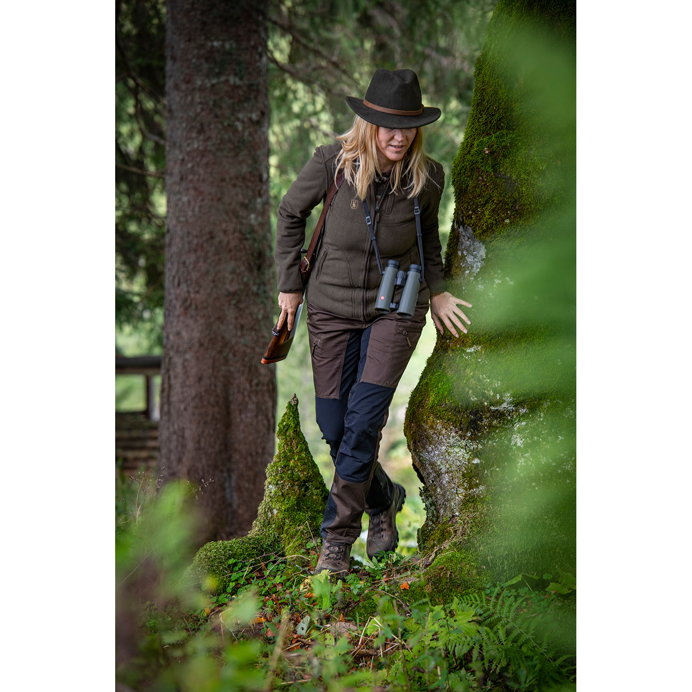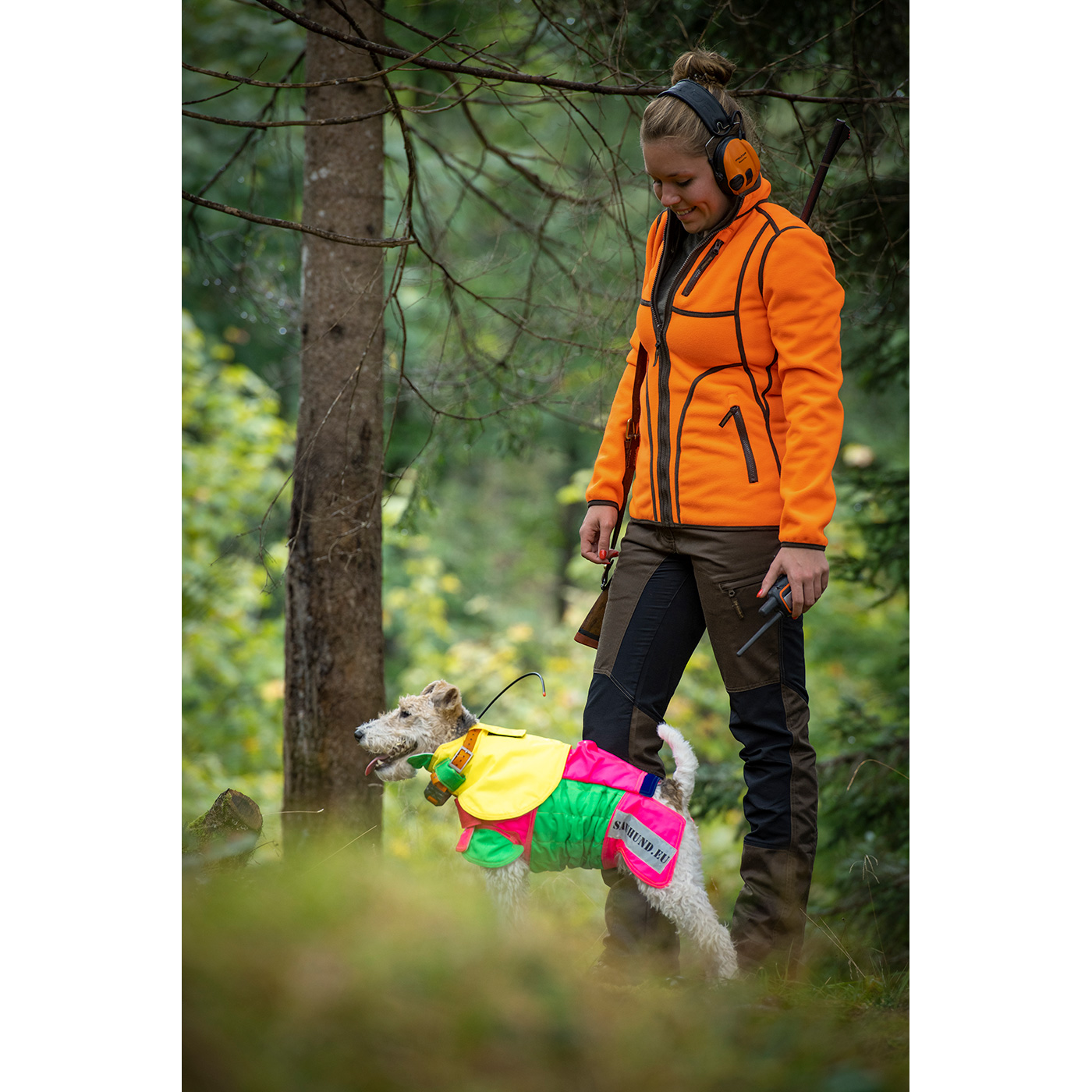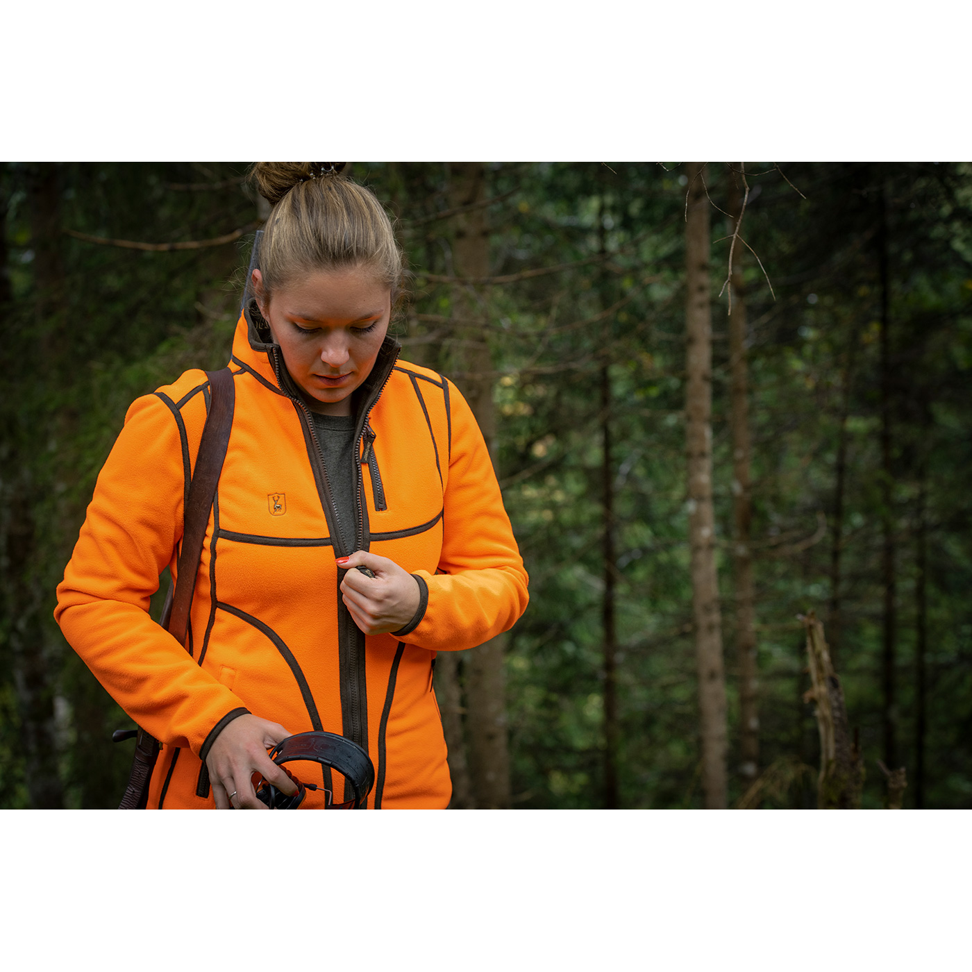 Die Wende-Fleecejacke Lady Pam Bonded ist mit der Deerhunter Stormliner Membrane ausgestattet und daher wasserdicht (5000 mm), winddicht (3000 g) und atmungsaktiv – wichtige Features für jede aktive Outdoor-Lady und eine vielseitige Lösung für alle Outdoor-Situationen. Ob Sie mit dem Hund spazieren gehen, die Kinder zur Schule bringen oder einen Tag auf dem Terrain verbringen: Die Wende-Fleecejacke Lady Pam Bonded aus Fleece bietet zwei tolle Modelle in einer Jacke. Der klassische Uni-Farbton und die paspelierte Einfassung aus Wildlederimitat der einen Seite sorgen für einen traditionellen Country-Look, der sich mit klassischen Jeans und Stiefeln zu einem eleganten, lässigen Outfit kombinieren lässt. Auf links gedreht bietet die Jacke mit ihrem leuchtenden Orangefarbton Sichtbarkeit im Terrain, ist CE-gekennzeichnet sowie nach PPE CAT II zertifiziert für zusätzliche Sicherheit. Drei Vordertaschen und drei Innentaschen mit verdeckten Reißverschlüssen runden die Jacke Lady Pam Bonded ab, die aus einem weichen, geräuscharmen Fleece gefertigt ist.