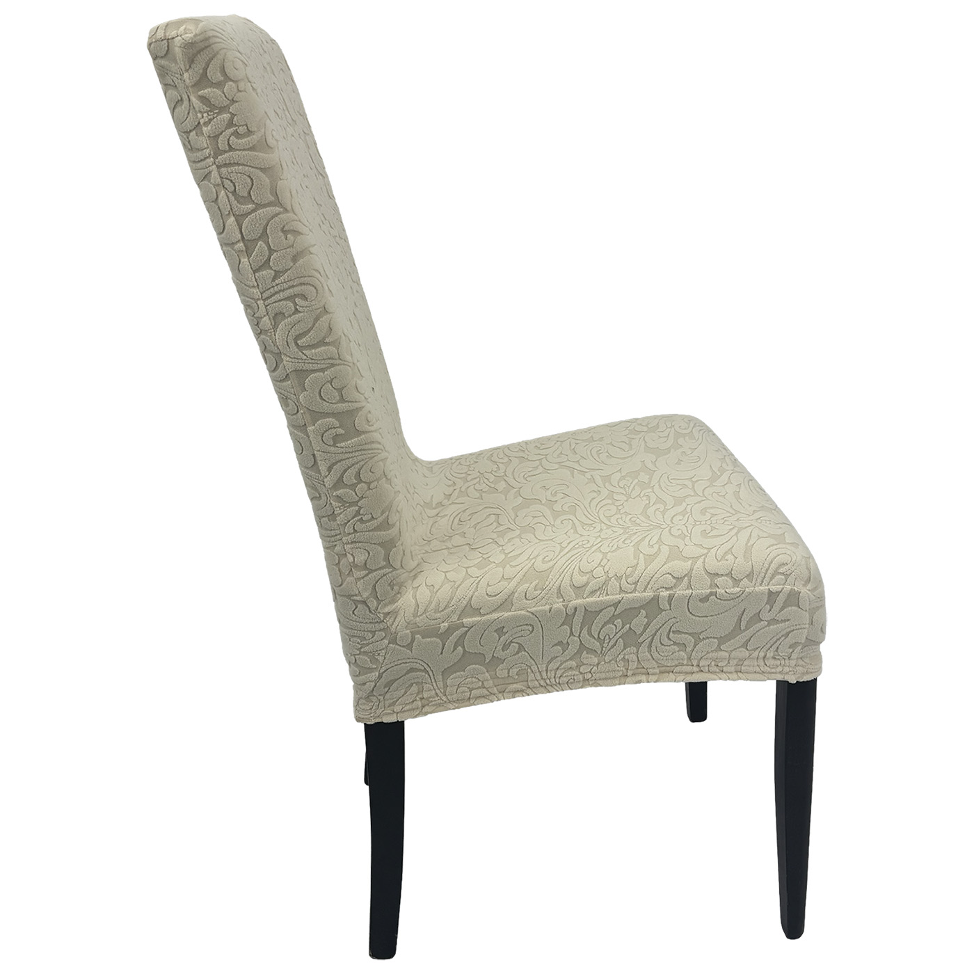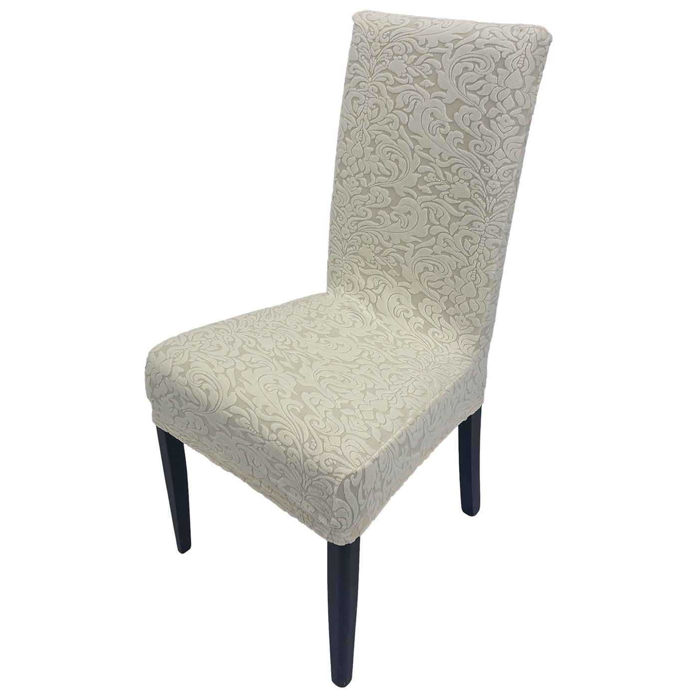 Die Stuhlhusse mit floral-ornamentalem Muster verleiht Esszimmer-, Küchen- oder Veranstaltungsstühlen im Handumdrehen eine elegante und wohnliche Ausstrahlung. Das dekorative, leicht klassische Design setzt stilvolle Akzente und sorgt für eine hochwertige Optik. Dank des bi-elastischen Materials passt sich die Husse gut an die Stuhlform an und sitzt angenehm straff. Der Materialmix aus 95 % Polyester und 5 % Elasthan macht sie zu einer praktischen Lösung, um Stühle optisch aufzuwerten und zugleich vor Abnutzung zu schützen.