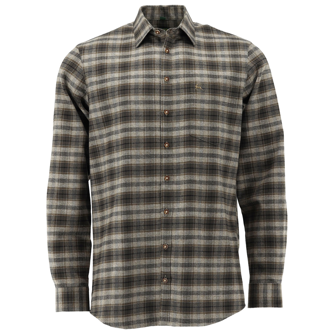 Klassisches Flanellhemd von OS-Trachten mit oliv/braunem Karomuster. Angenehmer, hautsympatischer Flanellstoff bietet Komfort und Stil zugleich. Mit Haifischkragen und einer aufgesetztem Brusttasche mit kleiner Hirsch-Stickerei, ist dieses Hemd die perfekte Wahl für jede Gelegenheit.