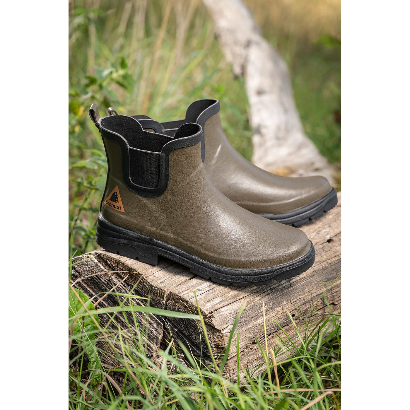 Der Schmidt Gummi-Halbstiefel ist ein Gummistiefel in der Form einer Stiefelette, bequem und gleichzeitig mit Stil. Er bietet hohen Tragekomfort und Wetterfestigkeit. Durch die niedrige Form ist er auch an wärmeren Tagen angenehm zu tragen. Die Anziehschlaufe an der Ferse und der elastische Einsatz an der Seite ermöglichen ein leichtes und schnelles An- und Ausziehen. Komfortable Stiefelette mit schnelltrocknenden Innenfutter und einer rutschfesten, gut profilierten, kräftigen Gummiprofilsohle. Die ideale Gummi-Freizeitstiefelette für den Wald, den Garten oder andere Einsätze in der Natur.