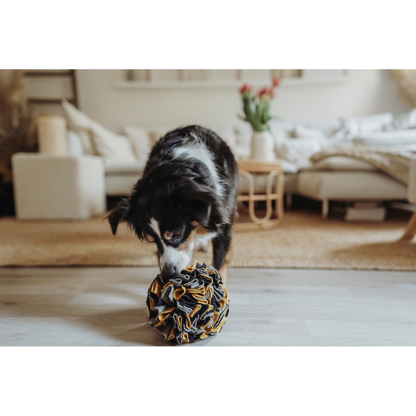 Mit kleinen, köstlichen Snacks bestückt, die der Vierbeiner mit Hilfe seines hervorragenden Geruchssinns ausfindig macht und »erbeutet«, erobert der Schnüffelball EIBY alle Herzen im Sturm. Die spielerische Nasenarbeit ist für Hunde weit mehr als ein reiner Zeitvertreib. Im Gegenteil – die aktive Beschäftigung mit dem weichen Ball, der zu 100% aus upgecycelten Materialien besteht, kann unsicheren Tieren zu mehr Selbstbewusstsein verhelfen und lebendige oder nervöse Charaktere dabei unterstützen, ausgeglichener zu werden und sich besser fokussieren zu können. Durch das gemeinsame Spiel des Tierhalters mit seinem Hund wird zudem die soziale Bindung gestärkt. Das erleichtert oftmals die Erziehung weil Zwei- und Vierbeiner sich durch die gemeinsam verbrachte Qualitätszeit näher stehen. Sobald alle Leckereien aus den einzelnen »Kammern« des Balls verputzt sind, ist Zeit für ein Nickerchen. Ob der weiche Schnüffelball dabei als Kissen dient oder stolz als »Trophäe« auf den Ruheplatz gebracht wird – fest steht, dass Hunde kaum genug von dem Schnüffelspielzeug mit DIY-Charakter bekommen können. Hinweis: Bitte das Tier beim Spielen nie unbeaufsichtigt lassen. Kein Spielzeug ist unzerstörbar. Um Verletzungen vorzubeugen, sollte das Spielzeug regelmäßig auf Beschädigungen oder lose Teile kontrolliert und gegebenenfalls ersetzt werden.