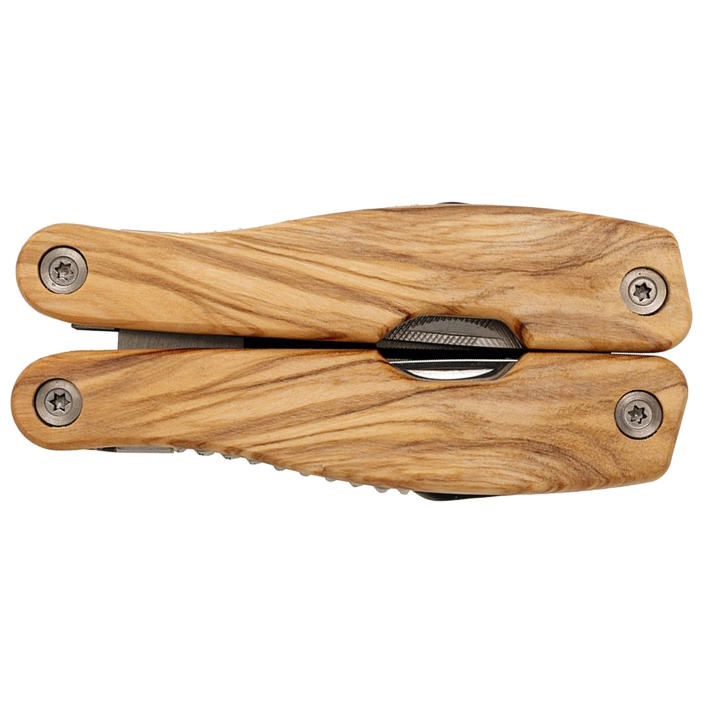 Das Multitool aus hochbeständigem Edelstahl (2CR13) und einem Griff aus edlem Olivenholz. Ausgestattet mit einer einfachen Sicherheitsverriegelung und 12 Funktionen: Universalzange, Seitenschneider, Messer, Feile, Dosenöffner, Flaschenöffner, Säge, Mini-Stanzwerkzeug, 3 verschiedene Größen von Schlitzschraubendrehern, Kreuzschlitzschraubendreher. Wird mit einer Gürteltasche aus Nylon geliefert.