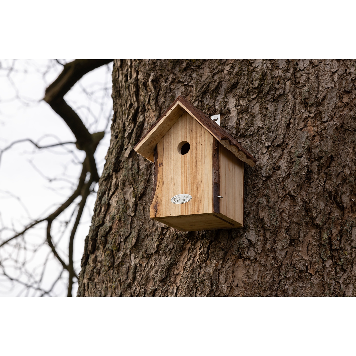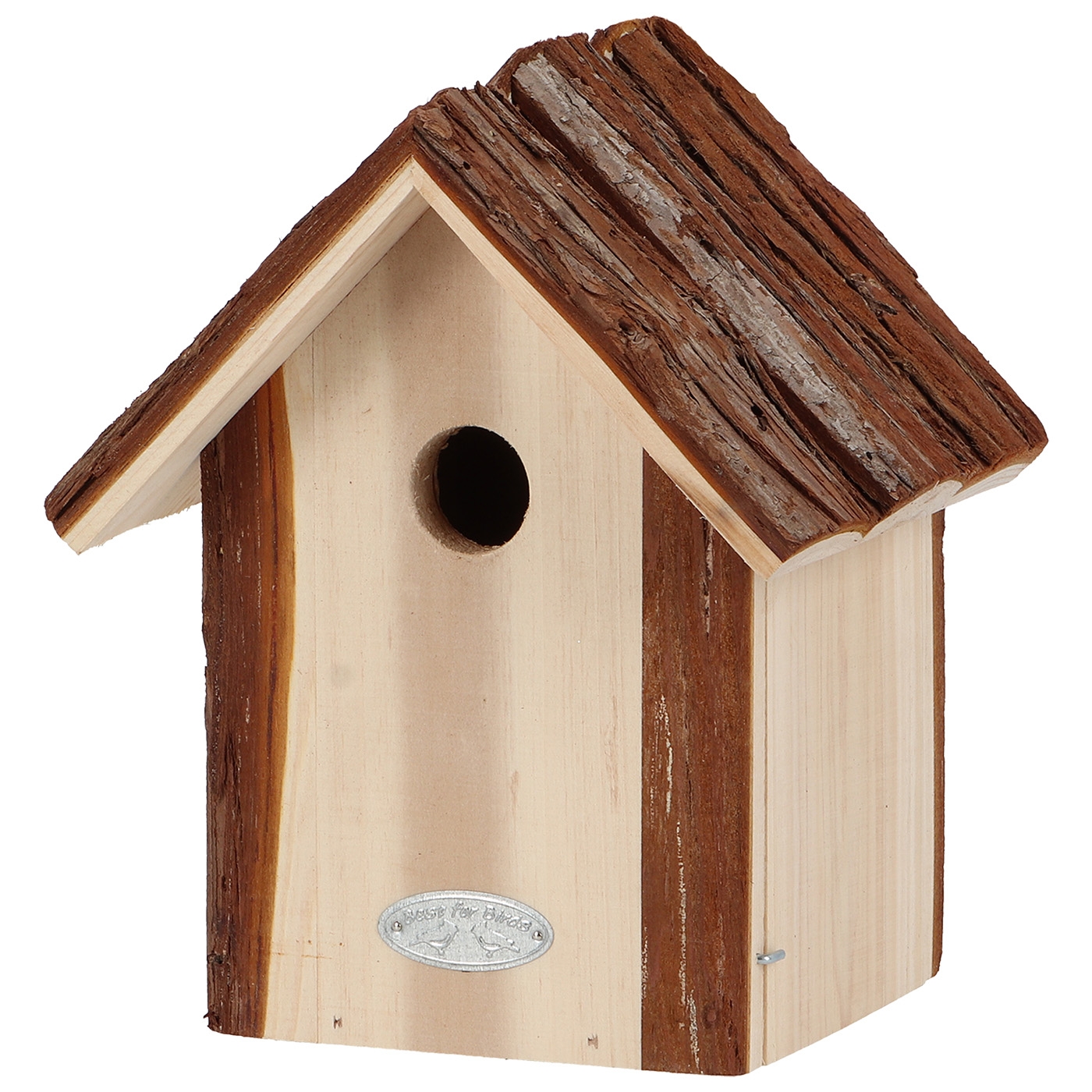 Dekorativer Nistkasten aus Tanne mit einem Rindendach im Natur-Style ist für Blaumeisen konzipiert, wird aber auch gerne von anderen Meisenarten genutzt. Maße: L 20 x T 17,8 x H 30,8 cm