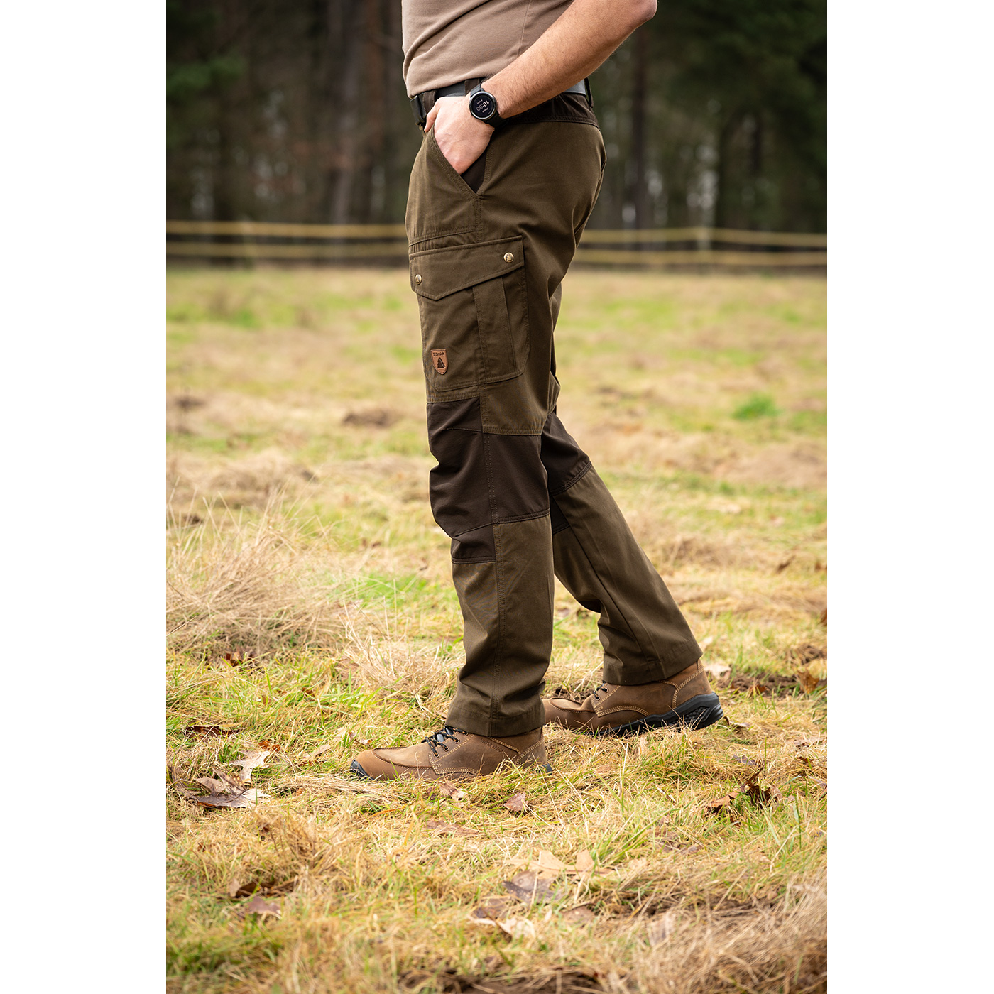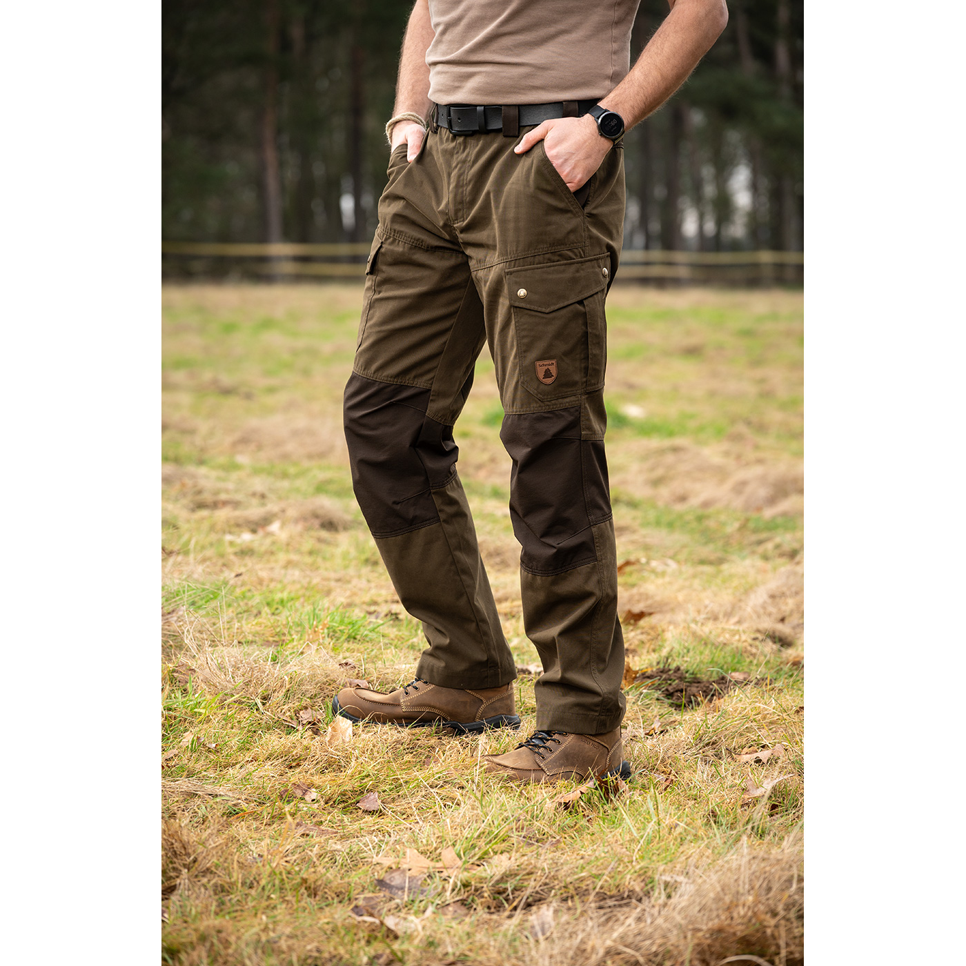 Die Outdoor-Stretchhose Münster von Schmidt ist die perfekte Sommer Hose für Jagd, Alltag und andere Outdoor-Aktivitäten. Diese Hose mit seitlichem Dehnbund kombiniert Funktionalität und Komfort, sie bietet ausreichend Stauraum mit 2 Seitentaschen, 2 Beintaschen mit Druckknopf-Verschluss und 1 großzügige Gesäßtasche mit Reißverschluss. Die breiten Gürtelschlaufen, die Stretcheinsätze und der vorgeformte Kniebereich sorgen für optimale Passform und ausreichende Bewegungsfreiheit. Mit dieser robusten, stilvollen Material-Kombination ist sie der perfekte Allrounder für die Jagd, beim Hundesport, Freizeit und andere Outdoor-Erlebnissen. Waschbar bei 40°C