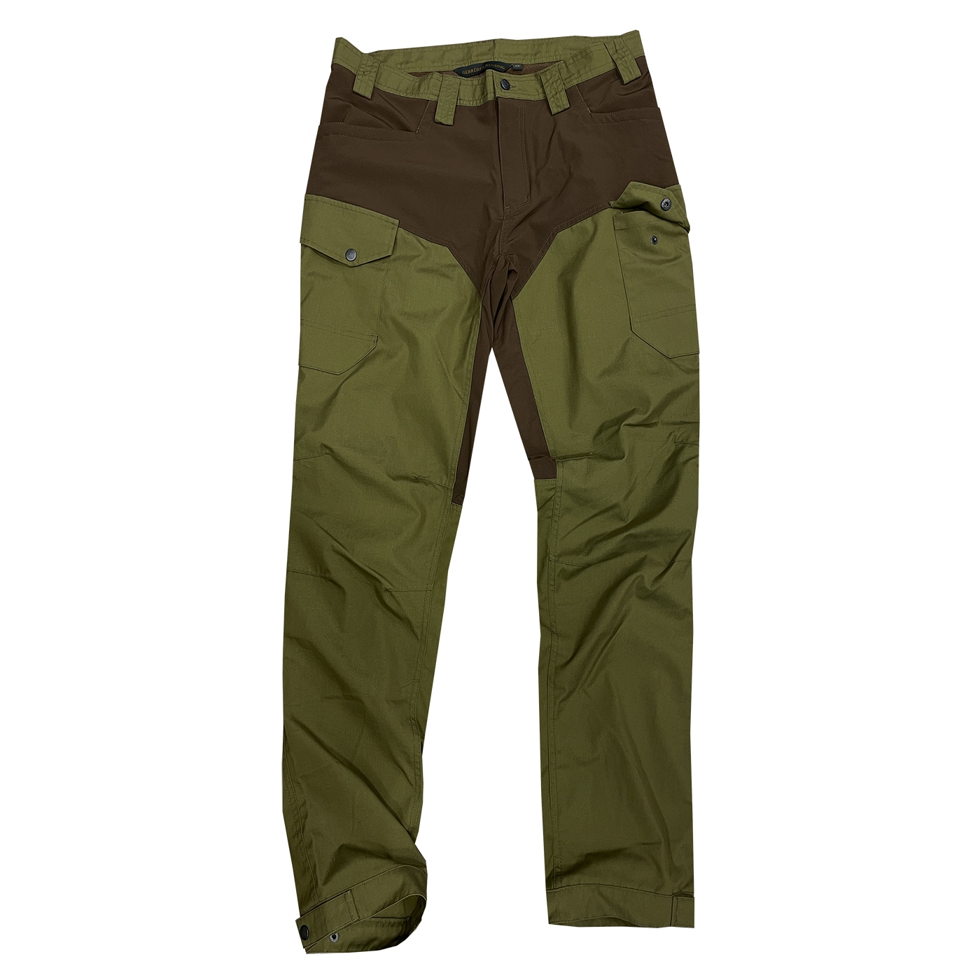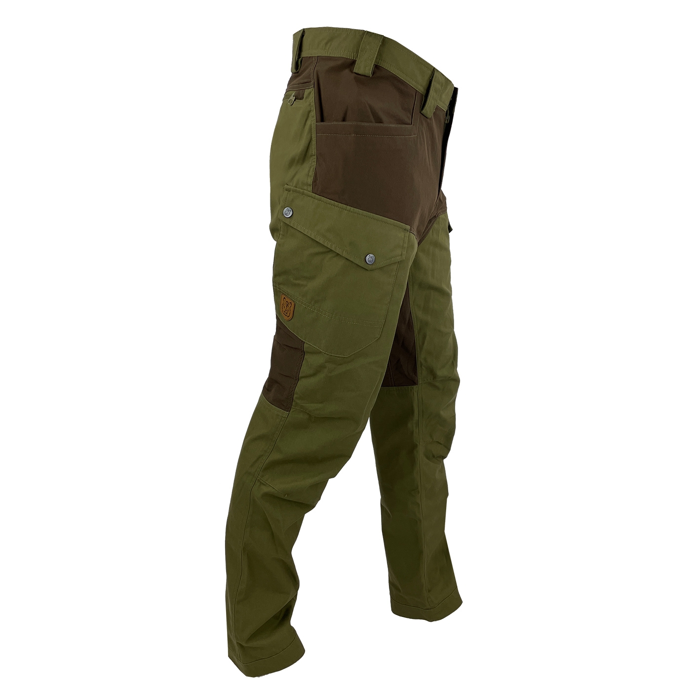 Rensing Outdoor Stretchhose Oak - Leichte Outdoor-Stretchhose mit vielen Details. Genau wie bei der ultraleichten Outdoorjacke Oak wurden bei dieser Stretchhose von Rensing angenehme Stoffe verwendet. Dadurch ist sie gut geeignet für Bewegungsjagden in Frühjahr und Sommer, aber auch wärmeren Tagen im Herbst. Die braunen Stretcheinsätze an Kniebeuge, Bund und Oberschenkel geben in den richtigen Momenten nach, um ein unangenehmes Verrutschen zu verhindern, daher ist sie für viele weitere Outdoor-Aktivitäten wie Wandern, Trekking oder Hundesport gut einsetzbar. Die großzügigen Beintaschen mit Patte lassen Geldbörse oder Jagdscheinetui schnell und sicher verschwinden, ohne später die Bewegung einzuschränken. Eine Messertasche links ist auch vorhanden und der stabile D-Ring an der Gürtelschlaufe hinten links, ermöglicht zusätzliche Unterbringung von Schlüsseln oder Ähnlichem. Die Stretchhose Oak der Marke Rensing hat zudem noch eine verschließbare Gesäßtasche und großzügige Einschubtaschen vorne. Durch 3 Druckknöpfe am Hosensaum kann die Beinweite am Fuß variiert werden. Wenn Sie einen leichten Revieranzug für Frühjahr, Sommer und Herbst suchen, ist diese Jagdhose in Kombination mit der leichten Outdoorjacke Oak (Art.879) genau das Richtige für Sie.