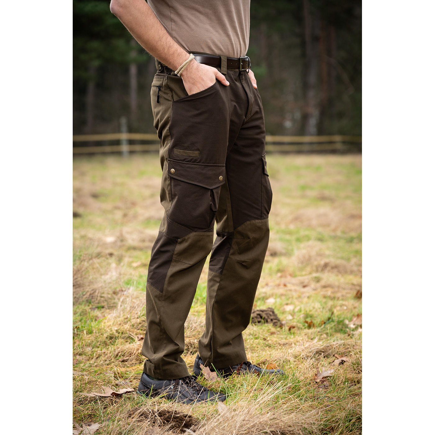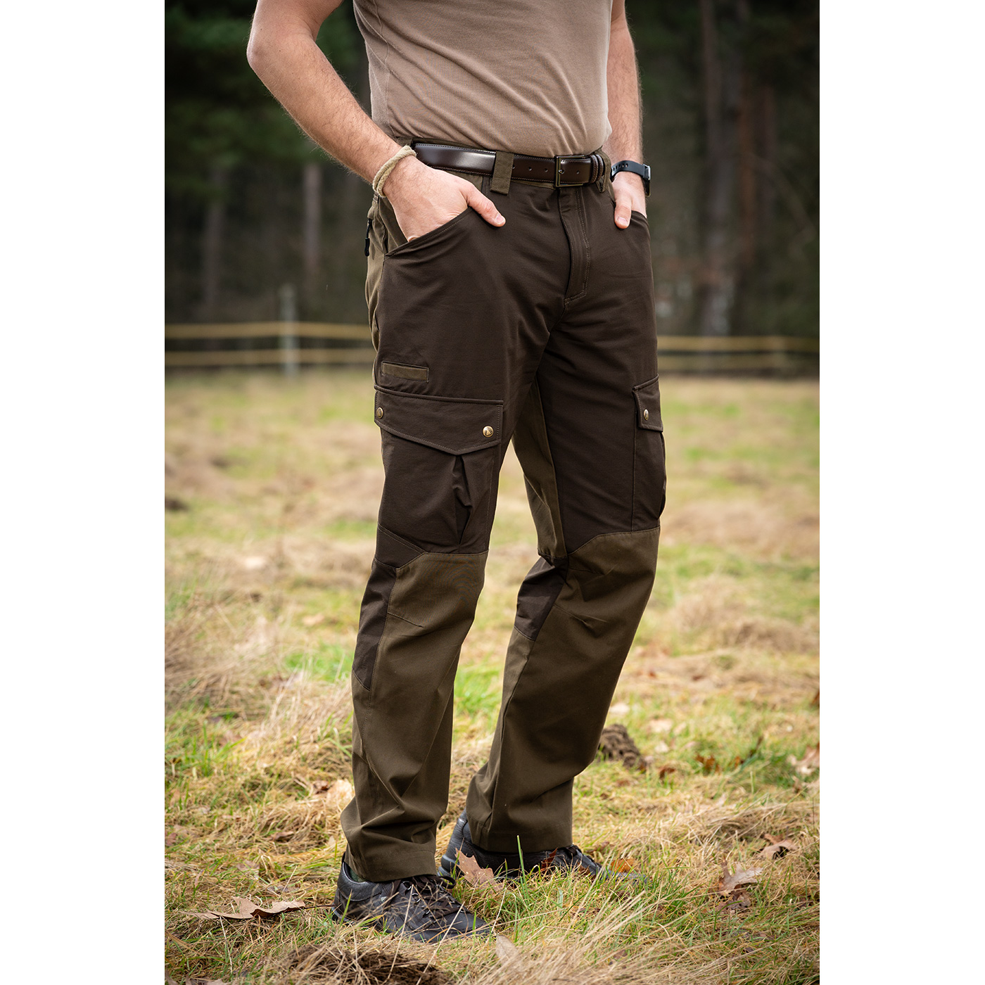 Die Outdoor-Stretchhose Siegen von Schmidt in braun/oliv ist die optimale, leichte Sommer Hose für Jagd, Alltag und andere Outdoor-Aktivitäten. Diese Hose kombiniert Funktionalität und Komfort, sie bietet ausreichend Stauraum mit 2 Seitentaschen, 2 Beintaschen mit Druckknopf-Verschluss und 1 großzügige Gesäßtasche mit Reißverschluss. Die breiten Gürtelschlaufen, die braunen Stretcheinsätze und der vorgeformte Kniebereich sorgen für optimale Passform, ein ausgezeichnetes Tragegefühl und ausreichende Bewegungsfreiheit. Mit dieser robusten, stilvollen Material-Kombination ist sie der perfekte Allrounder - bequem, elastisch, nachgiebig und anpassungsfähig. Bei langen Wanderungen in der Sonne, Revierarbeiten im Wald, beim Hundesport oder bei entspannten Trekkingtouren haben Sie eine Outdoorhose mit höchstem Tragekomfort. Waschbar bei 40°C