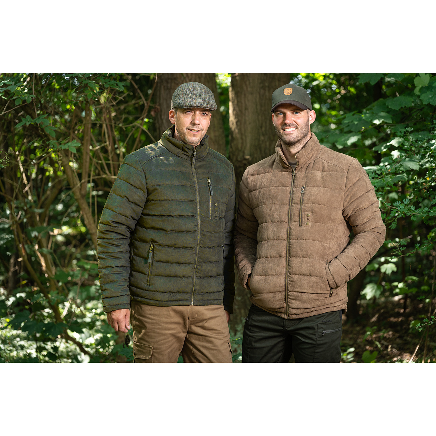 Mit dieser schicken Outdoorjacke bleiben Sie auch im Alltag stets dem jagdlichen Stil treu. Die samtige Haptik und der moderne Schnitt verleiht Ihnen beim Stammtisch, einer Schulung oder dem Jungjäger bei der Anfahrt zur Prüfung ein jagdlich gepflegtes Erscheinungsbild. Natürlich kann sie auch im Wald und der Natur mit Ihren praktischen Eigenschaften punkten. Ob sie dort Ihre Freizeit verbringen oder zur Jagd, diese Jacke passt. Der weiche Oberstoff schluckt nerviges Rascheln und bietet dazu noch erhöhten Tragekomfort. Die bauschige Fütterung hat zudem eine isolierende Wirkung und macht die Steppjacke zu alldem noch windabweisend. Dabei fällt vor allem der verlängerte Rücken ins Gewicht, der diesen Komfort noch unterstützt. Nicht nur Wind, auch leichten Regen hält sie notfalls ab, durch Ihre wasserabweisende Funktion, die mittels eines guten Imprägniersprays noch verstärkt werden kann. Ein Stehkragen schließt die das klare, praktische und edle Design ab. Diese jagdliche Steppjacke hält warm, sorgt für ein gutes Erscheinungsbild und lässt Ihnen aber noch genug Bewegungsfreiheit für körperliche Aktivitäten. Durch diese Vielseitigkeit ist diese Outdoorjacke besonders in der Übergangszeit im Frühling und Herbst, aber auch für kalte Sommernächte eine gute Wahl. Die beiden Außentaschen lassen genug Stauraum für Taschenlampen, Hundepfeifen, Patronen, Locker und andere kleine Hilfsmittel, die durch einen robusten Reißverschluss ausreichend gesichert sind. Weitere wichtige Utensilien finden in der Brusttasche Platz, die mit dem senkrechten Reißverschluss eine schnelle Zugriffsmöglichkeit bietet. Durch diese drei Reißverschlusstaschen können Sie sich sorgenfrei der Jagd, dem Hundesport und weiteren sportlichen Aktivitäten widmen. Ein perfekter Allrounder für den stilsicheren Jäger, Wanderer und weitere Outdoor-Begeisterte.