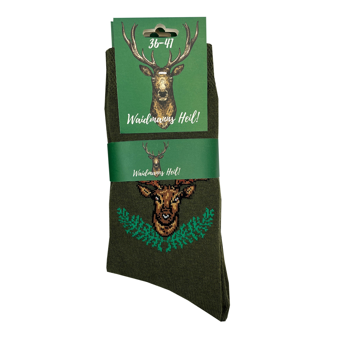 Jagdliche Socken mit tollem Hirschmotiv. Mit Bund ohne Gummidruck.