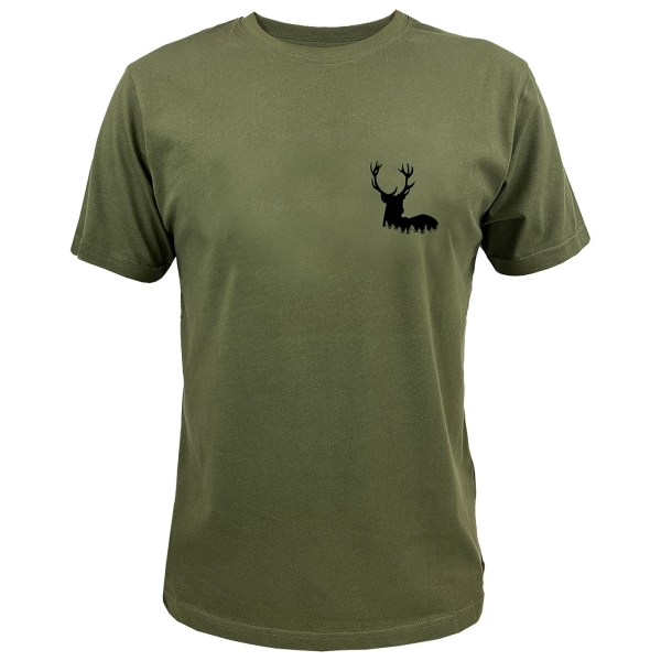 Entdecken Sie unser hochwertiges olivgrünes T-Shirt mit "Hirsch" Druck aus weicher, hautfreundlicher Baumwolle für ultimativen Tragekomfort. Mit seinem bequemen, geraden Schnitt und dem klassischen Rundhalsausschnitt ist dieses T-Shirt vielseitig zu kombinieren und perfekt für jeden Tag. Die kurzen Ärmel sorgen für optimale Bewegungsfreiheit, während das leichte Material mit ca. 160g/m² angenehm auf der Haut zu tragen ist.
