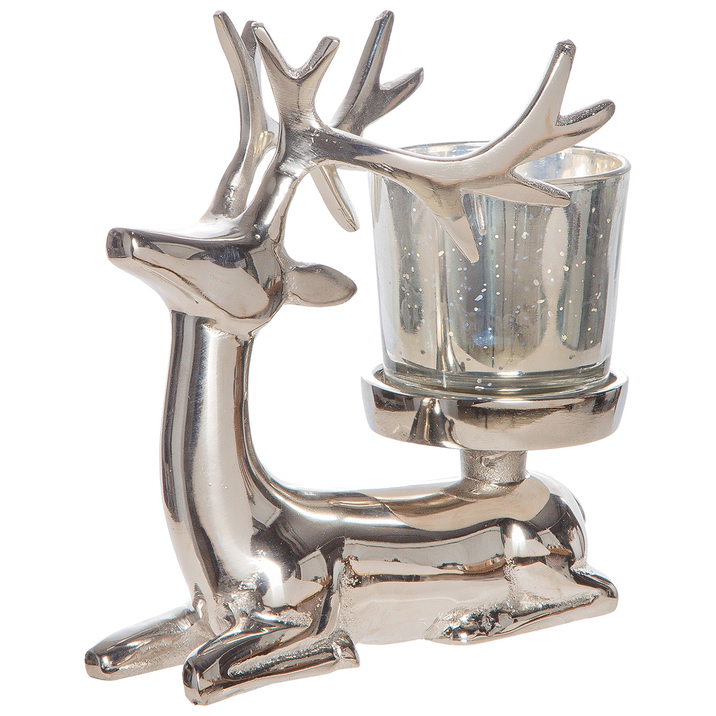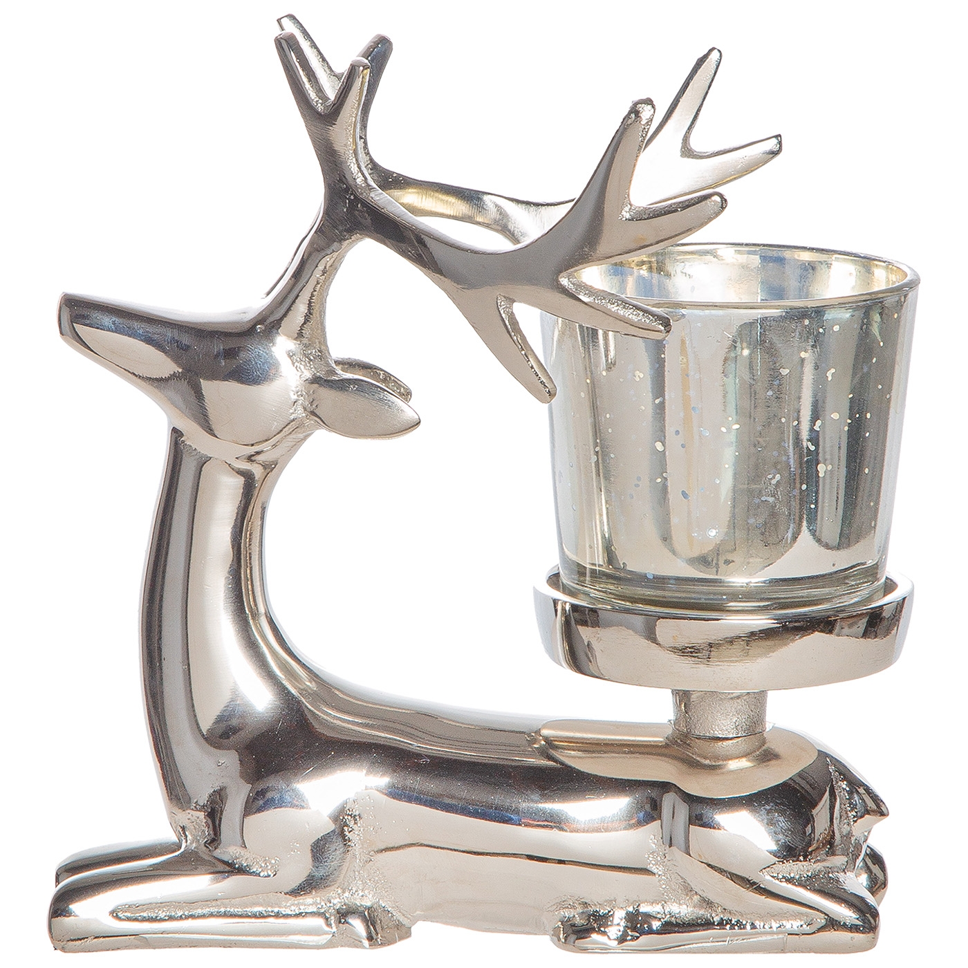 Stilvoller Teelichtleuchter, liegender Hirsch "Aksel", in silberfarben, glänzend, aus Aluminium, mit Glaseinsatz (Ø 6cm, Höhe 5,5 cm) - ideal für eine gemütliche Atmosphäre in der kalten Jahreszeit. Gesamt-Maße: L 8 x B 13,5 x H 14 cm. Ein Teelicht ist nicht im Lieferumfang enthalten.